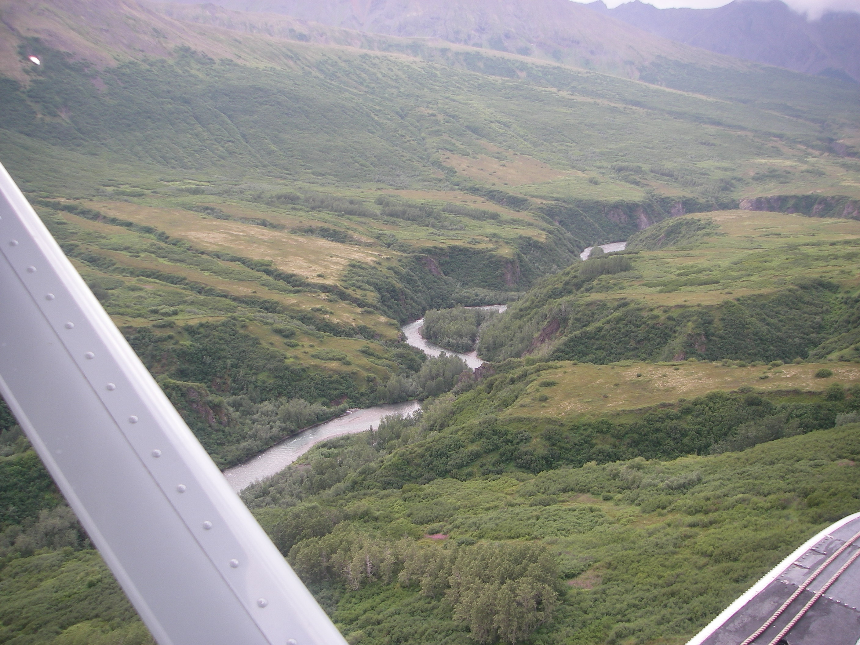 The stream beds got more rugged as tributaries increased the stream flow. Here a creek has cut a deep path through the easiest route it could find, as seen from the air on the way to Upper Togiak Lake. Aklun Mountains, Alaska.