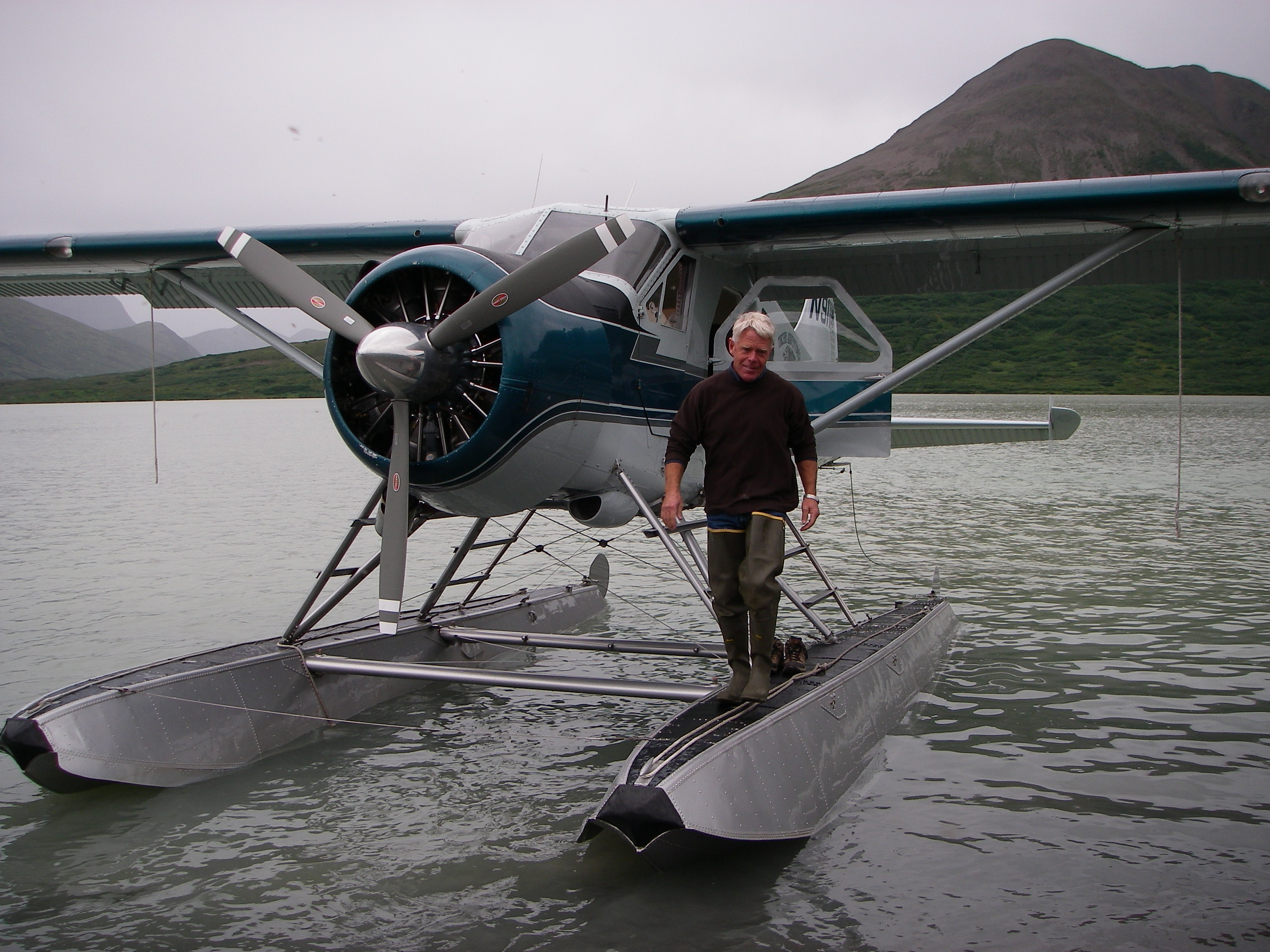 Rick, the team's pilot in and out of the Aklun Mountains, arrives to take the team from Cascade Lake to Upper Togiak Lake, after an anxious day of waiting out the weather for a break that would allow for safe flying. Cascade Lake, Alaska.