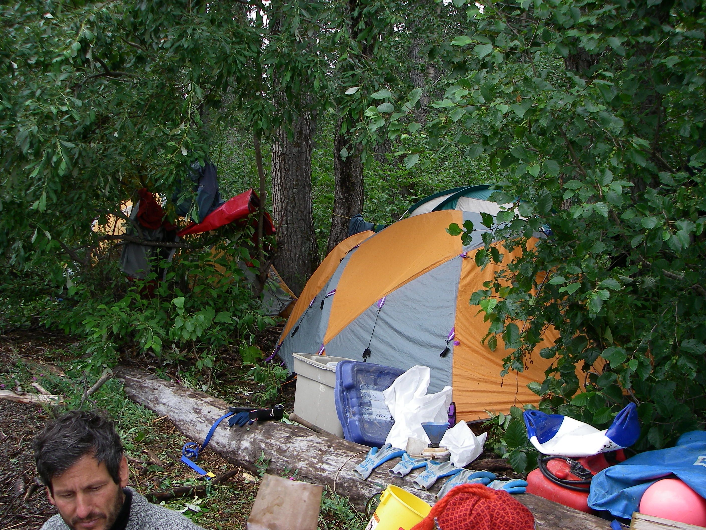 This shot, taken from the one-meter-wide beach shows how crowded the team's campsite was at Upper Togiak Lake. Upper Togiak Lake, Alaska.