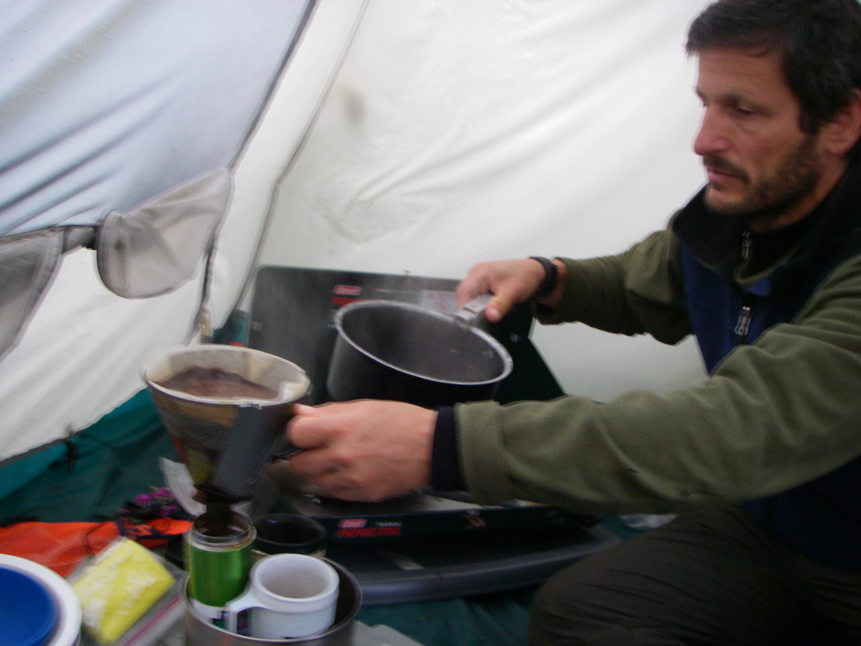 The first person into the cook tent every morning boiled water and made coffee for the rest of the team. Here Darrell Kaufman works to start the day off right. Upper Togiak Lake, Alaska.