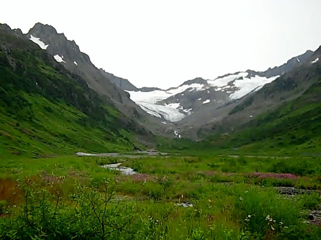 Looking up the valley at the head of Allison Lake you can see a system of glaciers that feed the lake with melt water and have carved the valley over time. Allison Lake, Alaska.