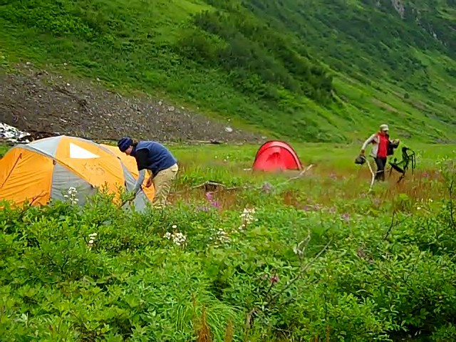 On the team's final morning at Allison Lake everyone pitched in to take down tents and pack up gear. Then they spent most of the rest of the day waiting for the clouds to lift enough for their pilot to come and get them. Allison Lake, Alaska.