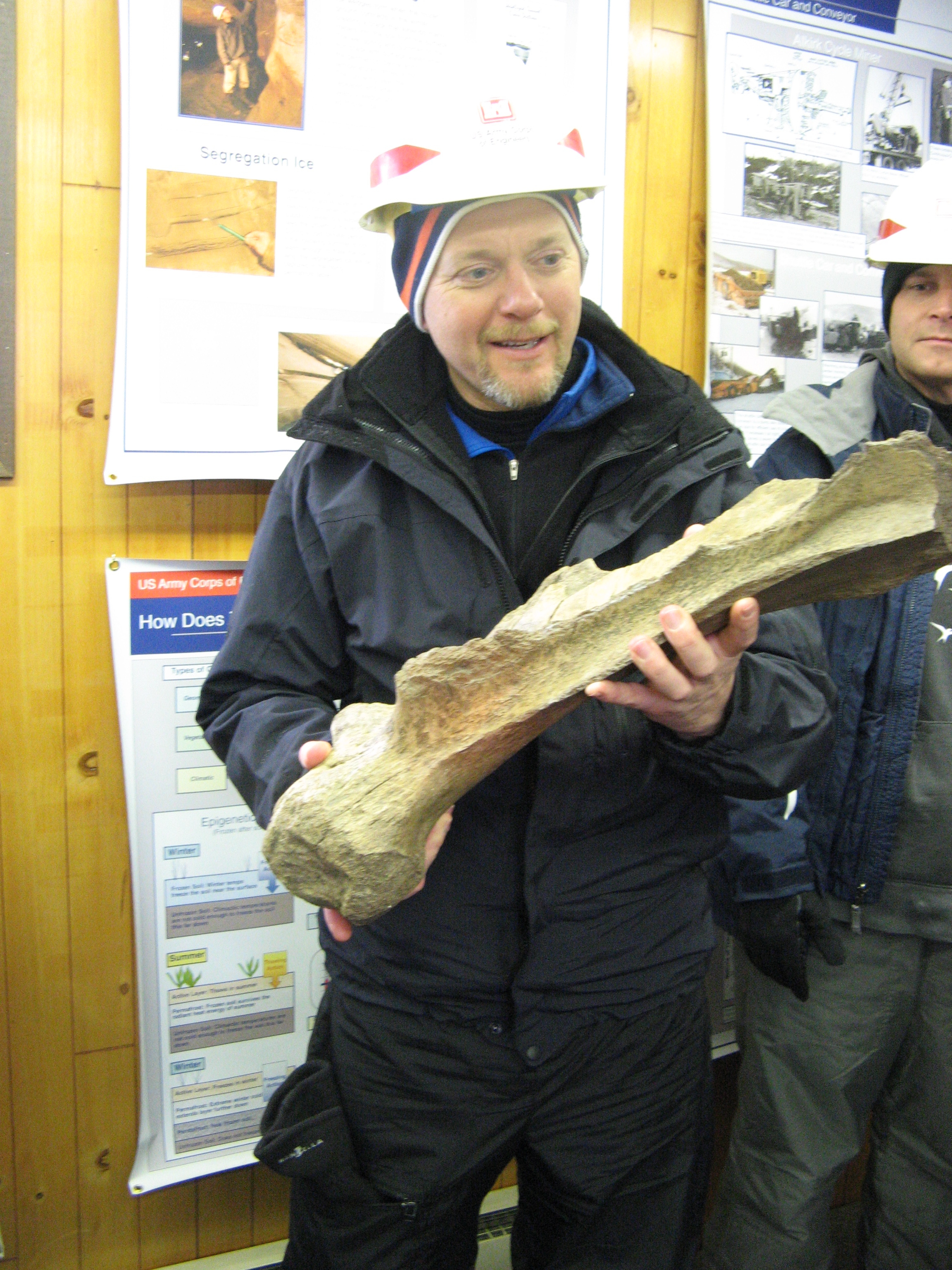Mike Rhinard holds a fossilized bone from a woolly mammoth. At the CRREL Permafrost Tunnel in Fox, Alaska.