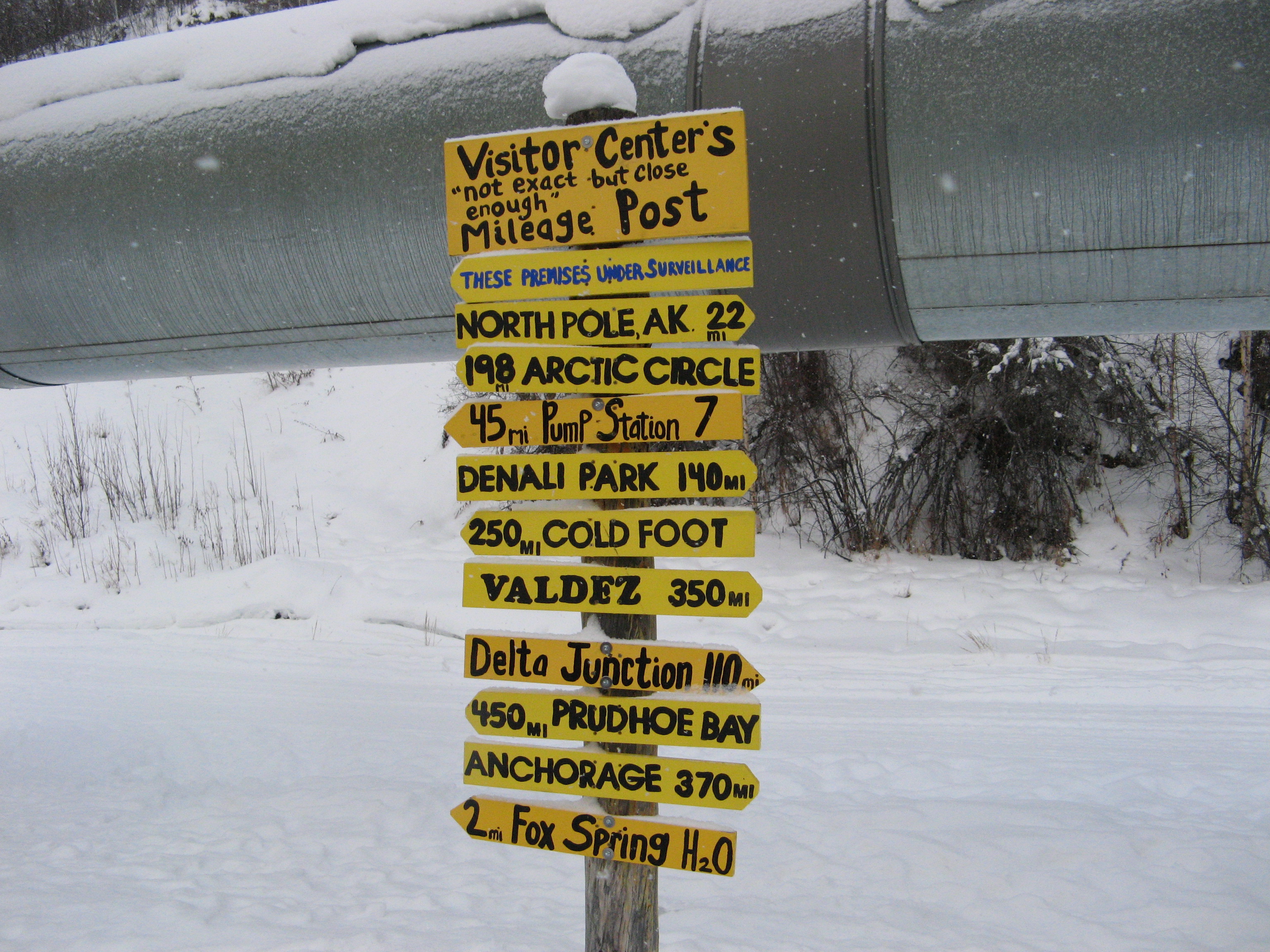 Signposts at the Trans-Alaska Pipeline in Fox, Alaska.