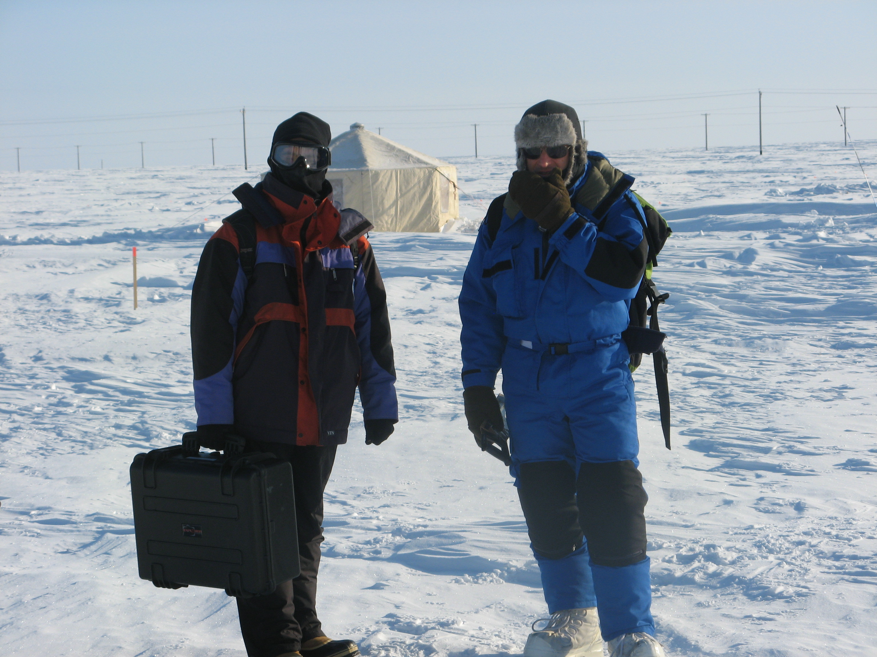 Manuel Barret (left) and Florent Domine (right) head out to survey in the snow field. At the Barrow Arctic Research Center (BARC) in Barrow, Alaska.