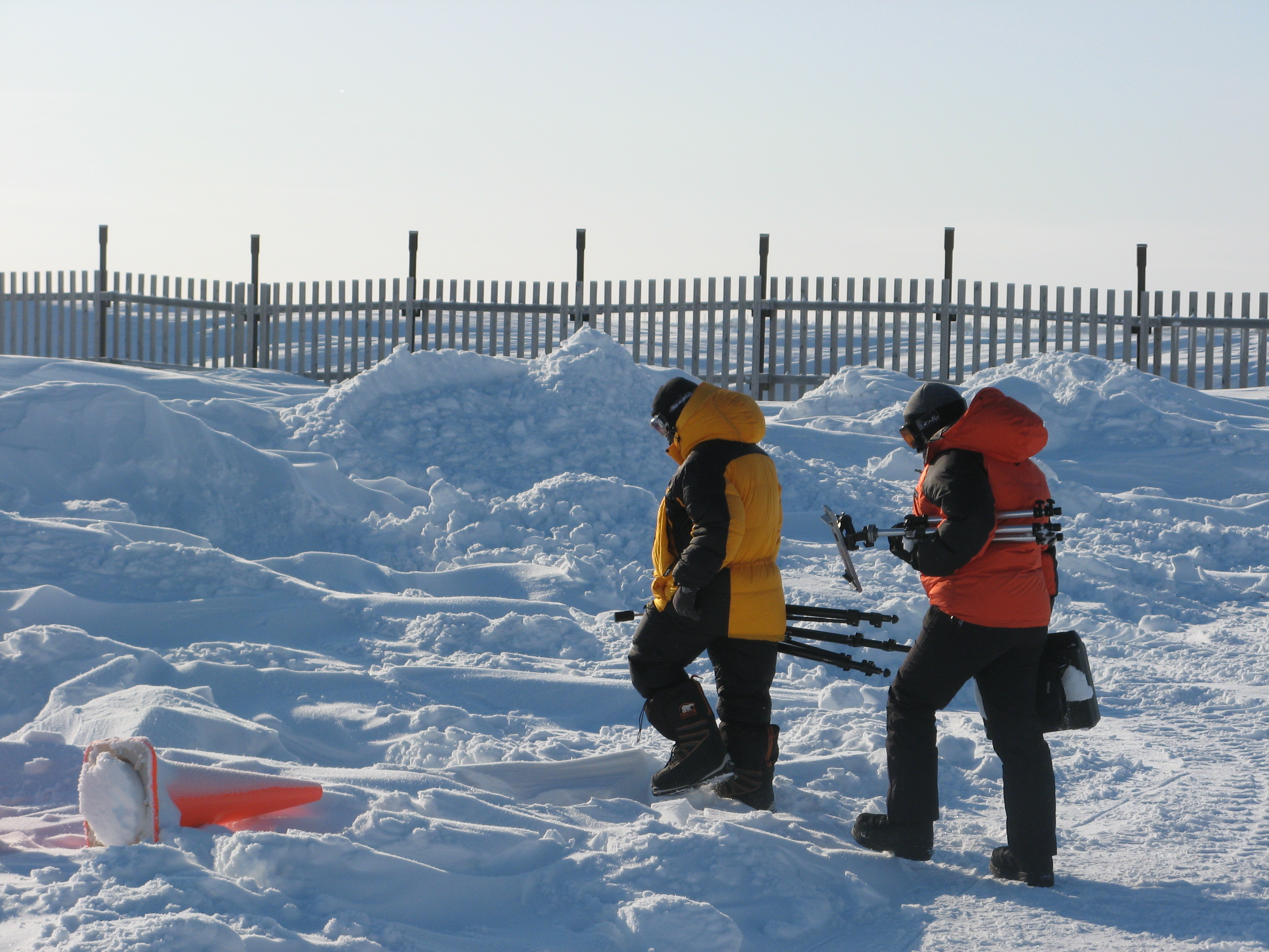 Holly Reay and James France head off to work in a snow field near the Barrow Arctic Research Center (BARC) in Barrow, Alaska.