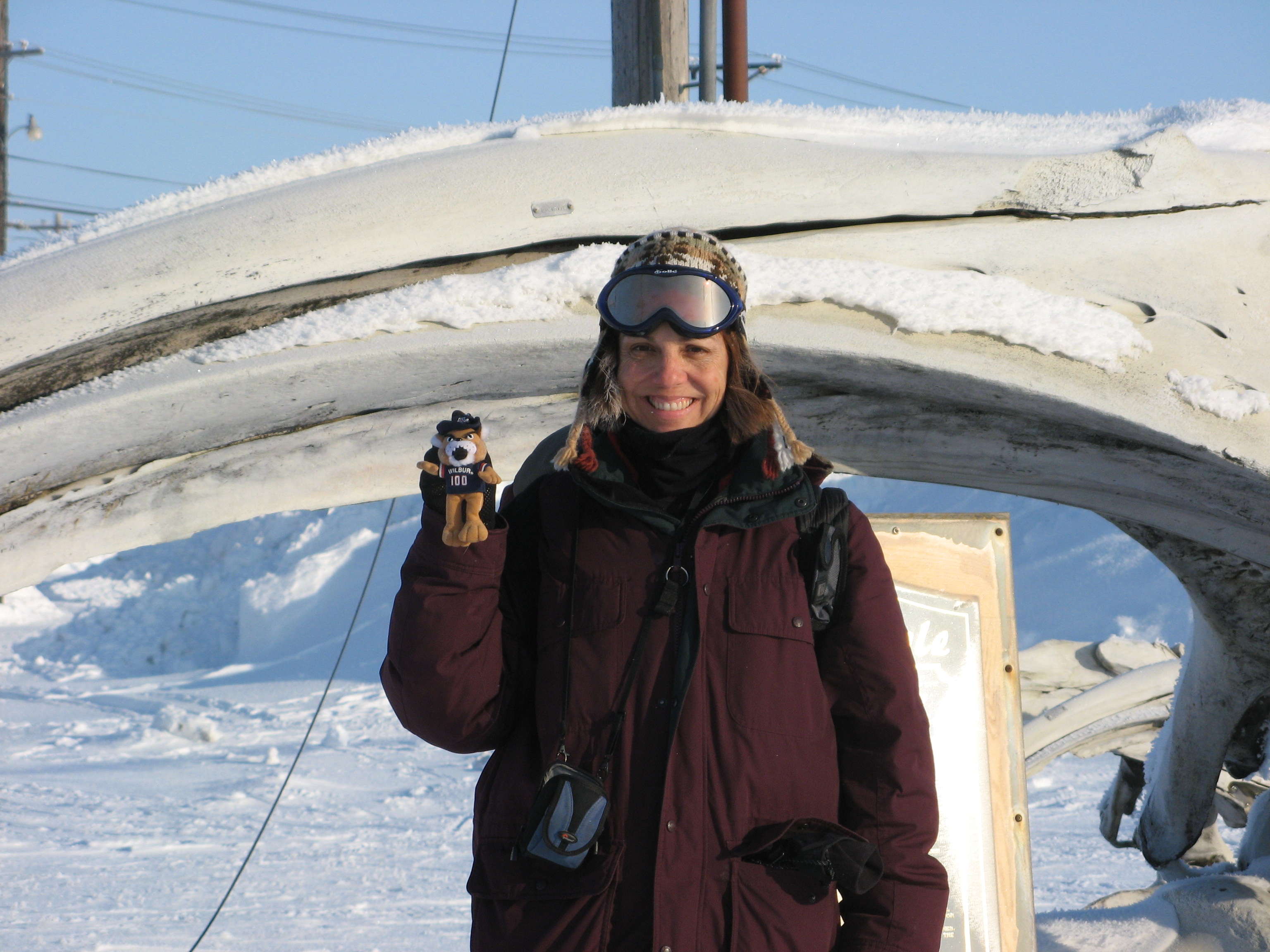 Betsy Wilkening and Wilbur the Wildcat in front of a bowhead whale jaw bone. At the Barrow Arctic Science Consortium (BASC) in Barrow, Alaska.