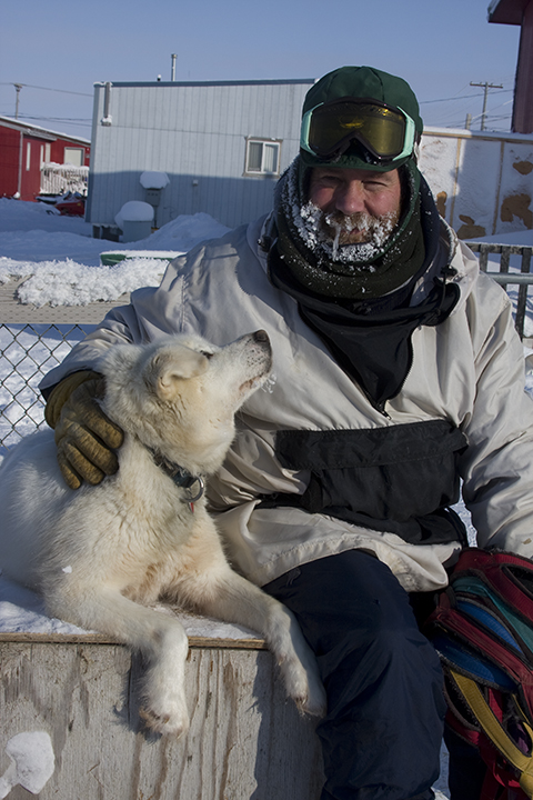 Geoff Carroll poses with Diamond, the lead sled dog, at end of the ride. Barrow, Alaska.