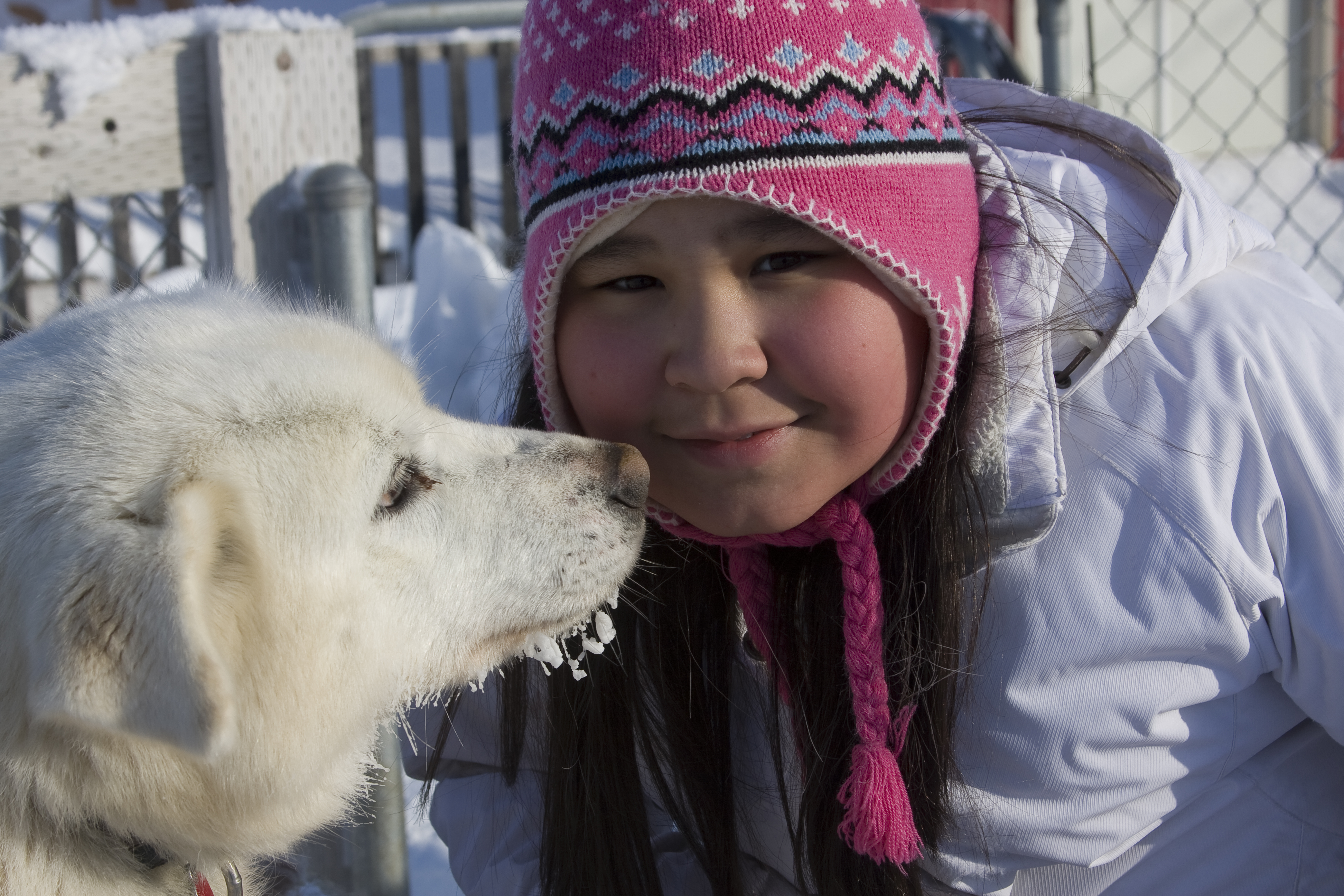 Mary poses with Diamond, the lead sled dog. Barrow, Alaska.
