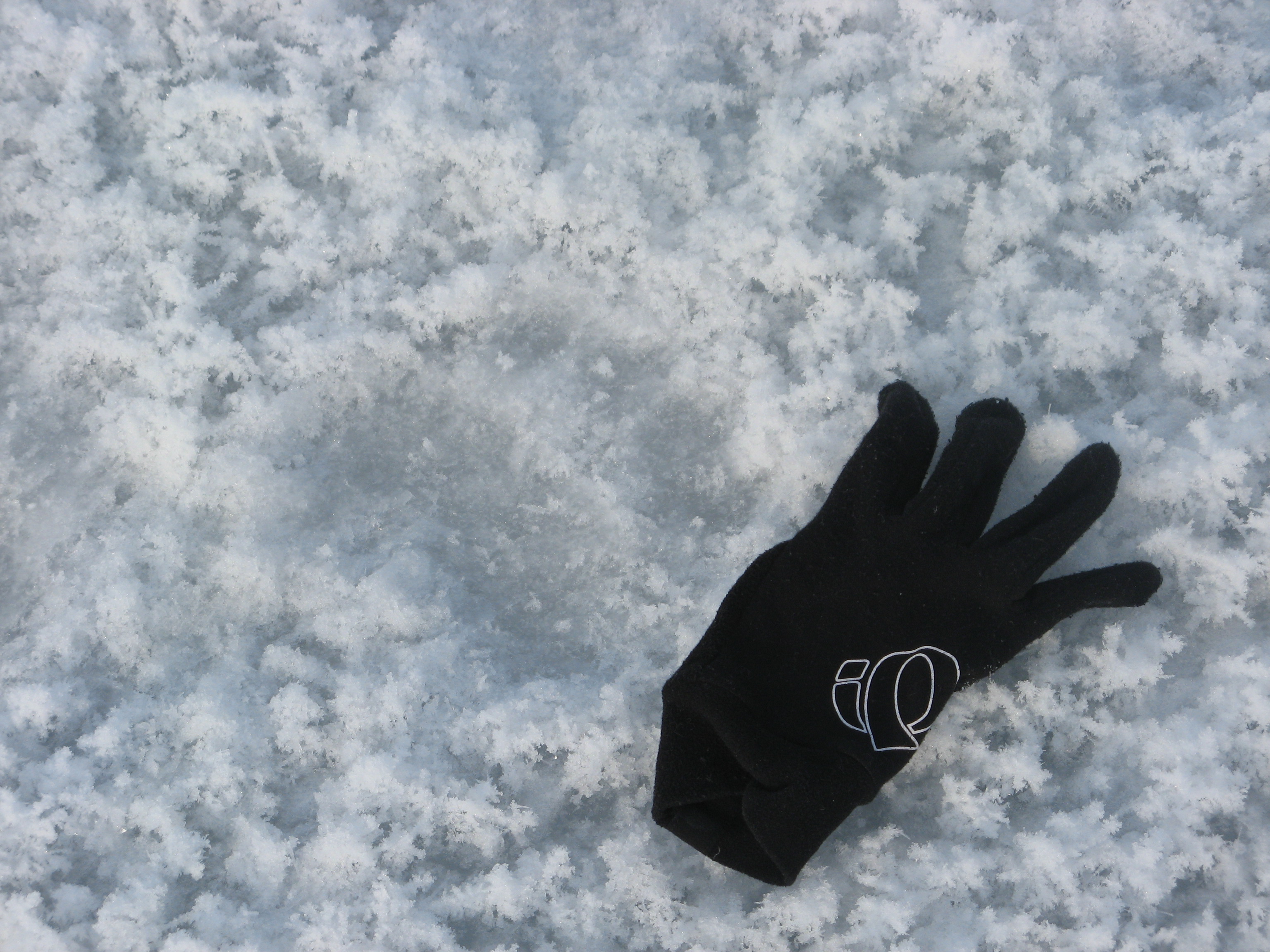 A glove next to a polar bear paw print. On the sea ice near Barrow, Alaska.