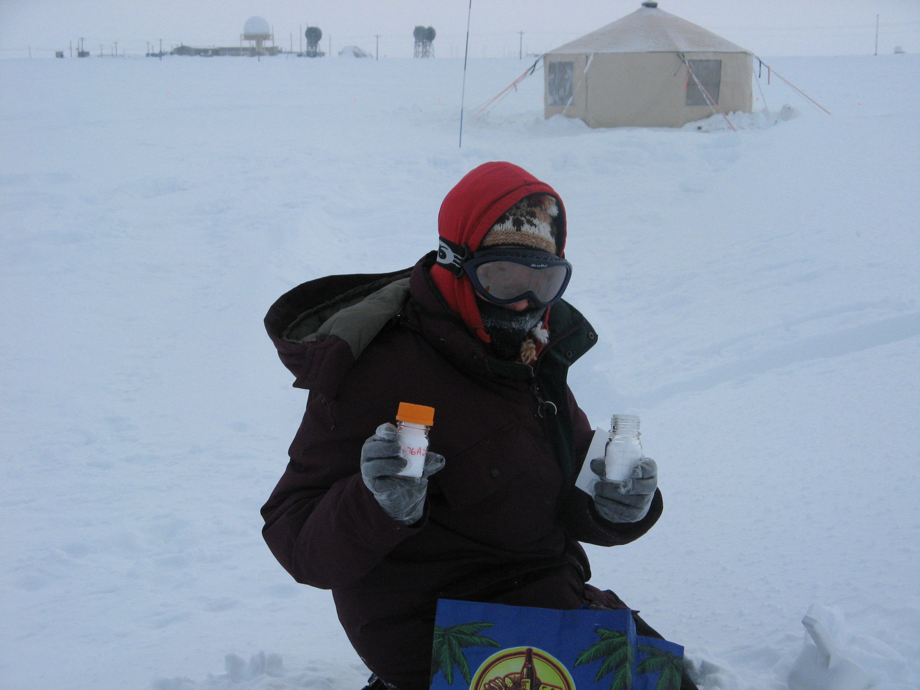 Betsy Wilkening samples snow on a grey windy day near the Barrow Arctic Research Center (BARC) in Barrow, Alaska.