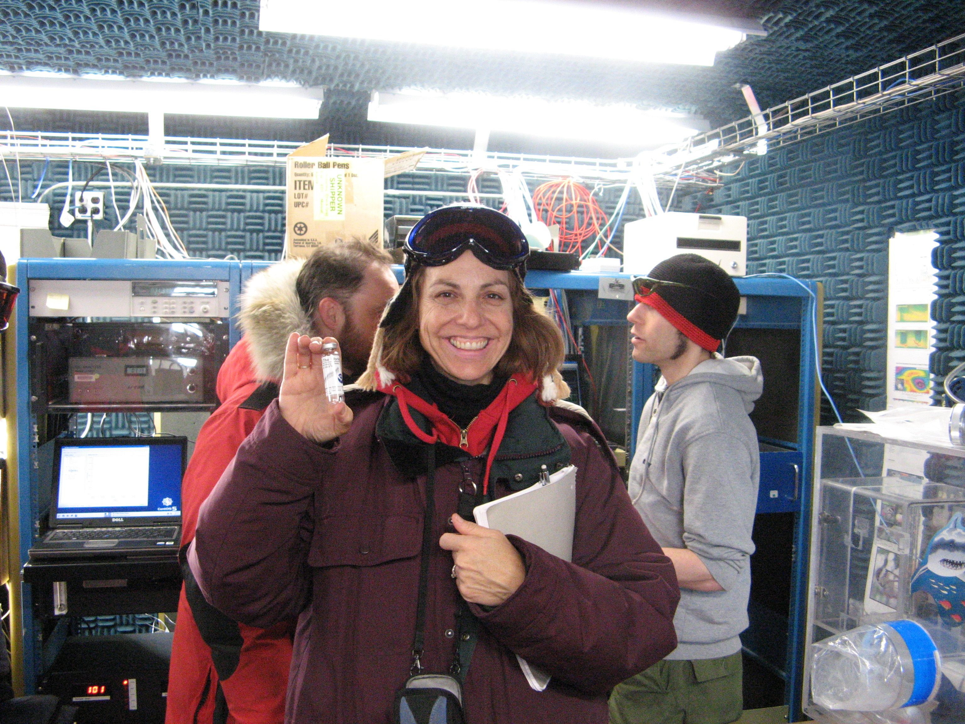 Betsy Wilkening poses with a sample bottle of air measuring atmosphere CO2 data at 393 ppm. At the NOAA CMDL Barrow Observatory in Barrow, Alaska.