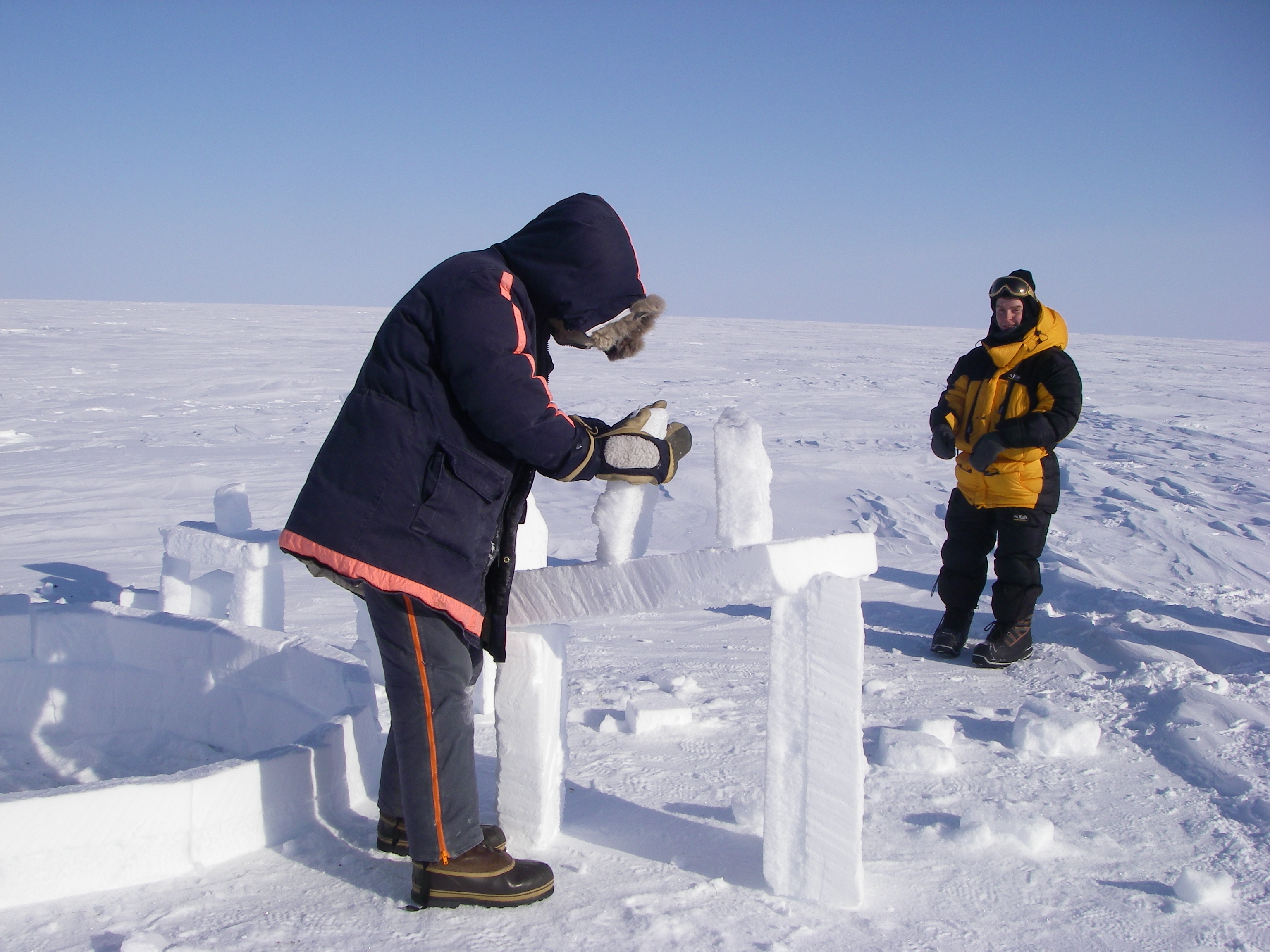Holgar Sihler puts the finishing touches on "snowhenge" while James France (from England) gives his approval. On the frozen tundra eight miles from the Barrow Arctic Research Center (BARC) in Barrow, Alaska.