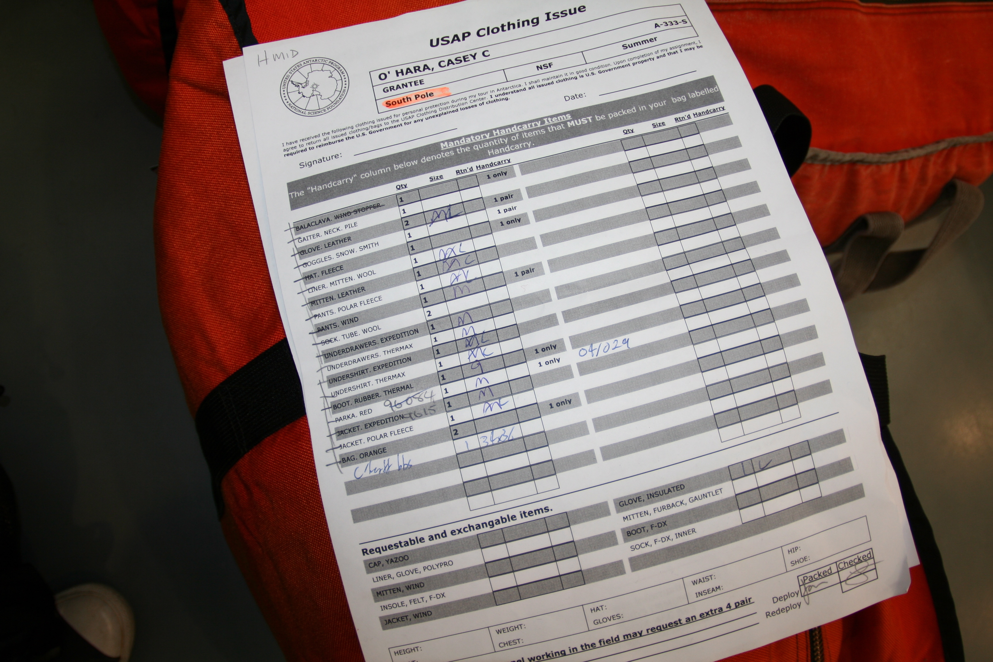 Casey O'Hara: "Here's my checklist of what goes into my ECW (Extreme Cold Weather) bags. Some of the items could be packed in the checked baggage, but the items that are listed in the 'hand carry' column we need to wear (or have immediately available) as we board the plane." Christchurch, New Zealand.