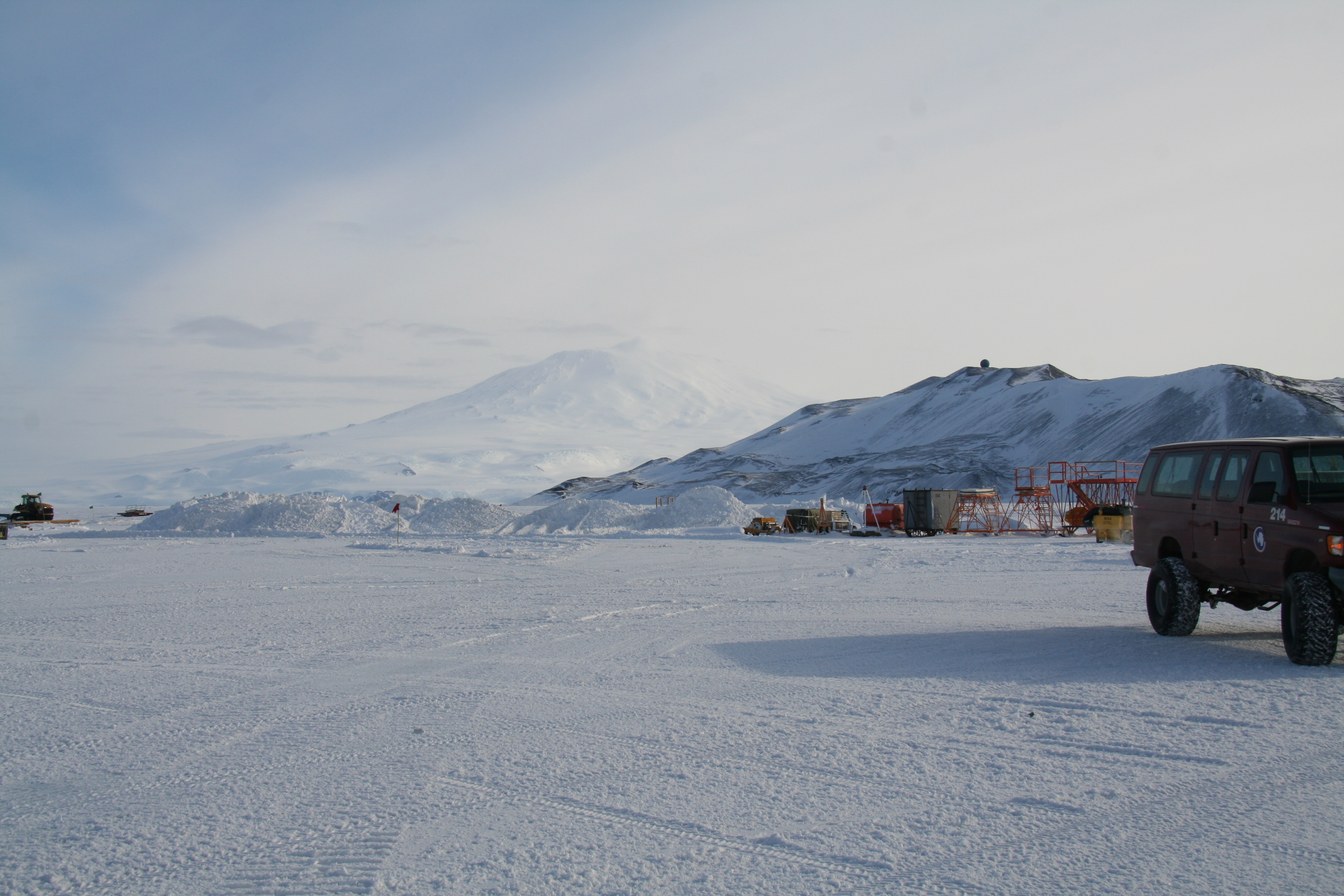 From the McMurdo airfield, looking back at Ross Island, Mt. Erebus is the large volcano far in the background. McMurdo Station, Antarctica.