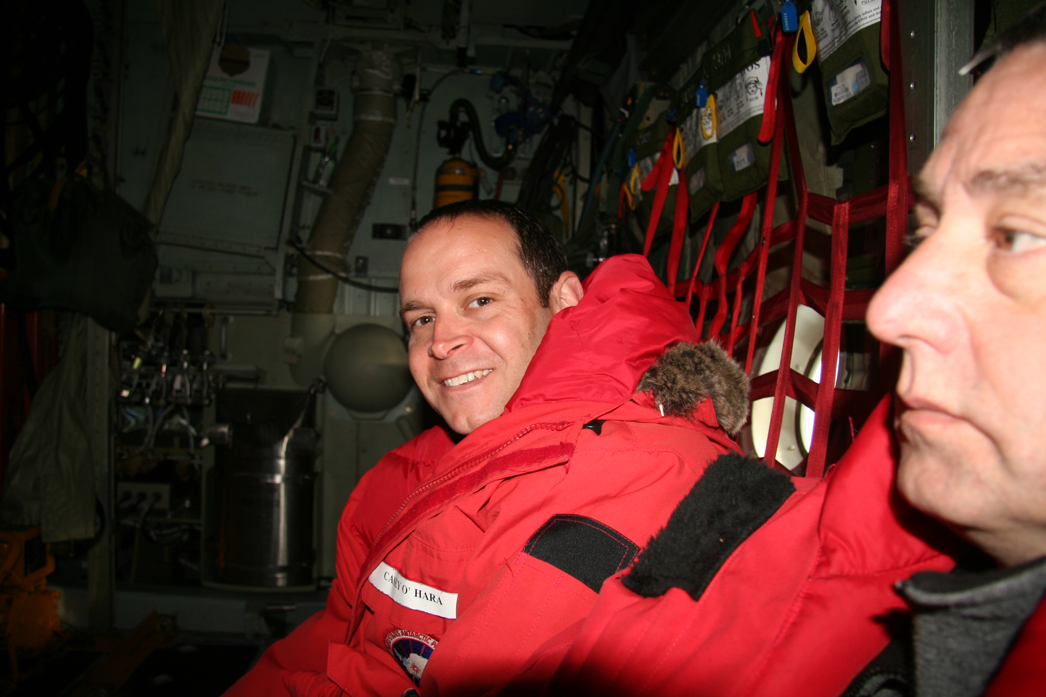 Casey O'Hara enjoys the flight to the South Pole in a C-130 Hercules flying above Antarctica.