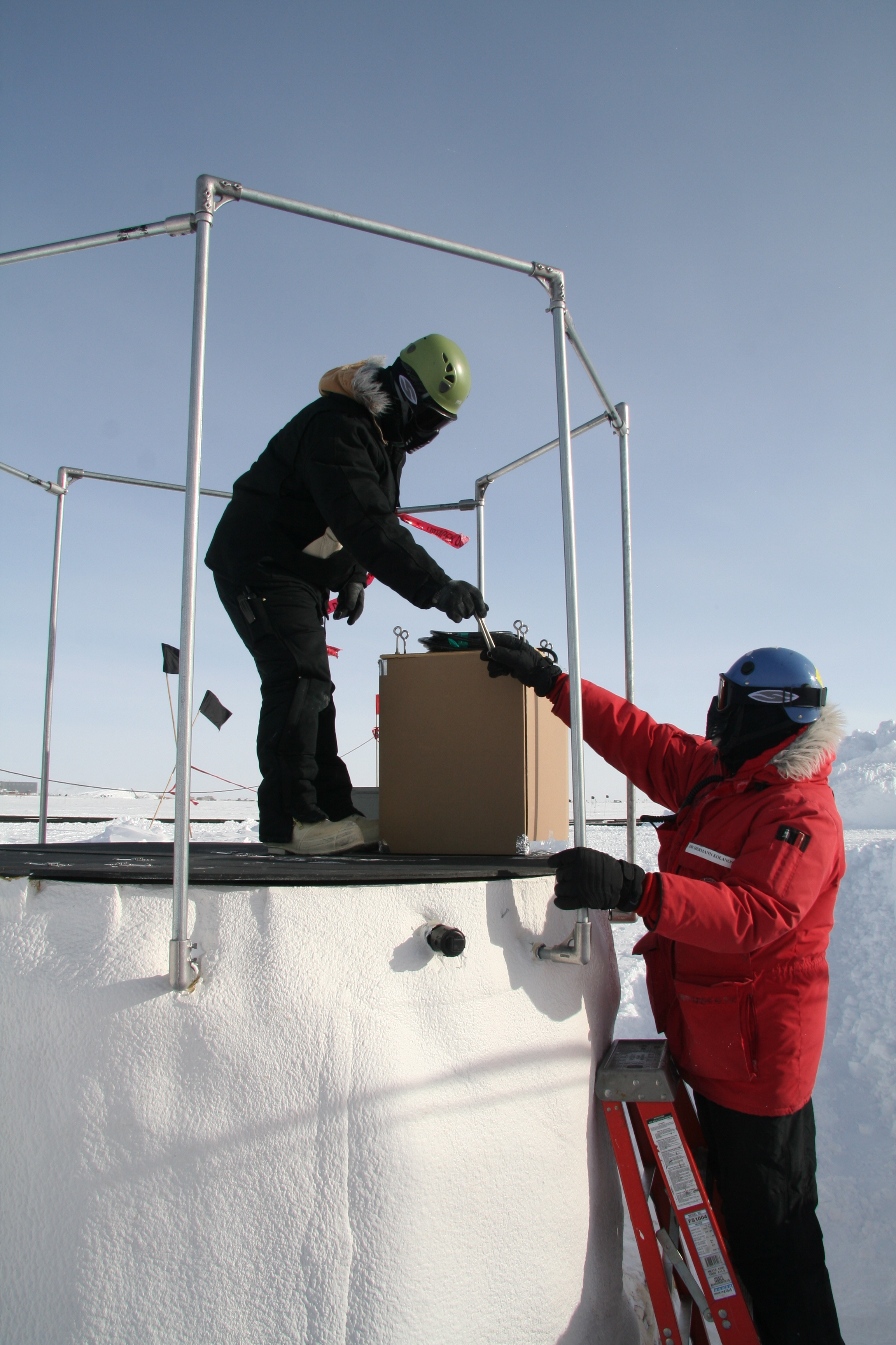 Dr. Hermann Kolanoski and Ralf Auer prepare a DOM (digital optical module) to be installed into the IceTop tank. Near the Amundsen-Scott South Pole Station, Antarctica.