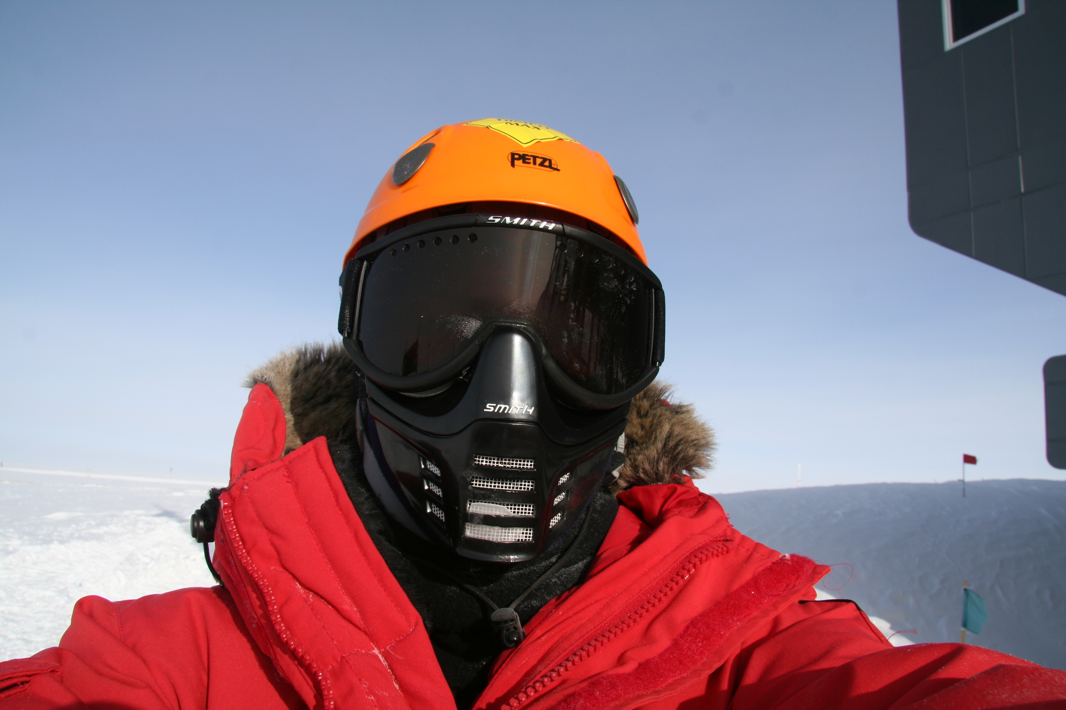 Casey O'Hara wears his protective Extreme Cold Weather (ECW) gear. The helmet is required in the Drill Camp for head protection, the goggles and face shield protect his eyes and face from the sun and wind, and the thick parka is for warmth. Near the Amundsen-Scott South Pole Station, Antarctica.