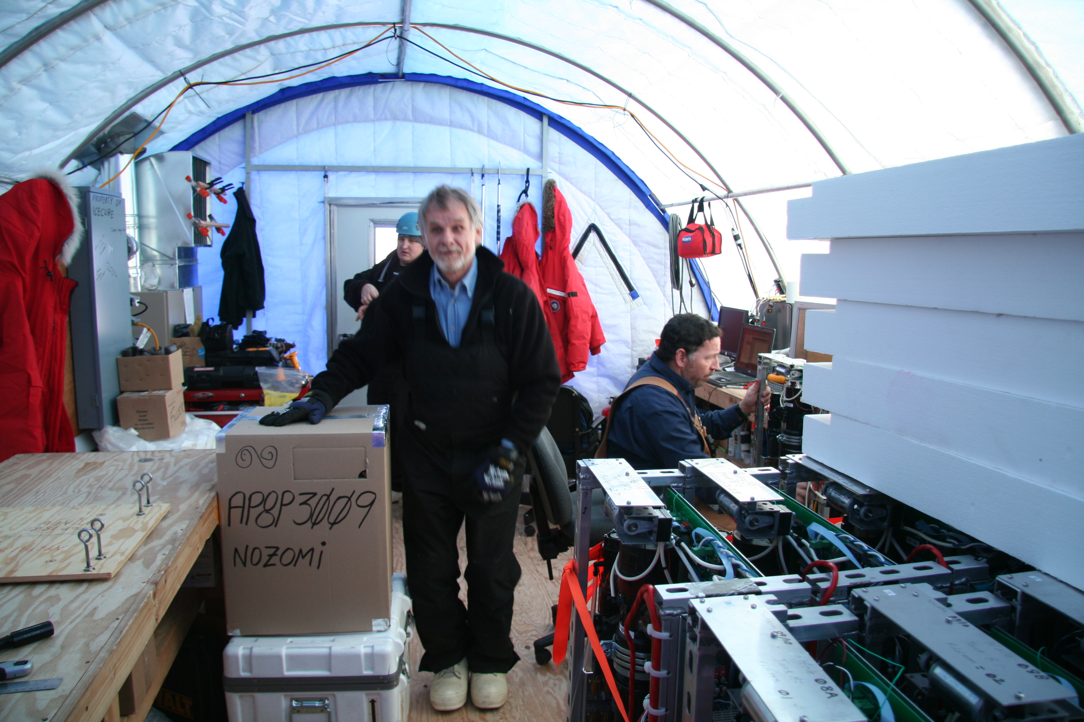 Inside the Purple Palace (the IceTop deployment tent), James Roth (seated), Dr. Hermann Kolanoski (walking towards camera), and Chris Elliott (background) plan for the deployment of more IceTop modules. Near the Amundsen-Scott South Pole Station, Antarctica.