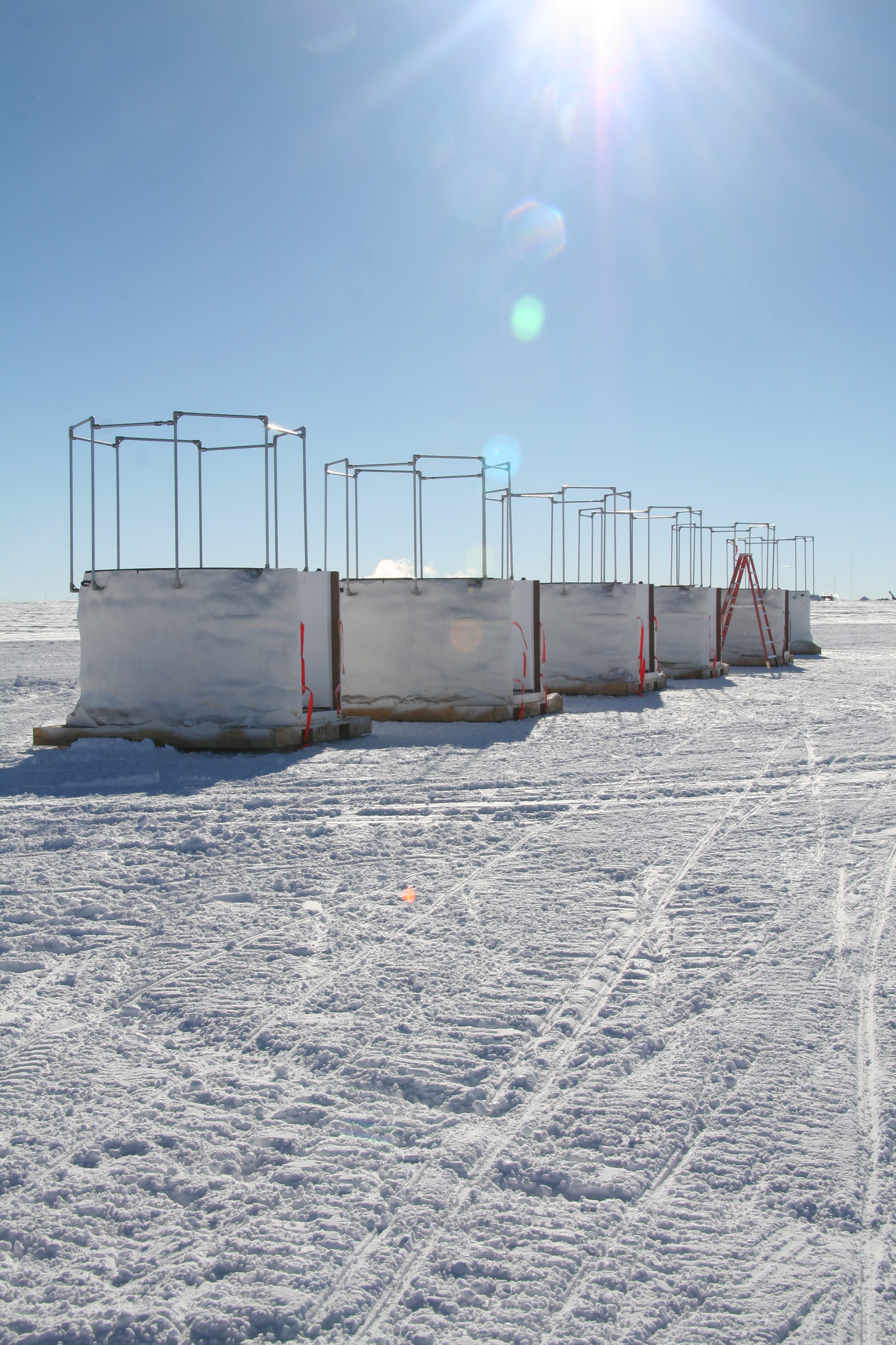 A row of IceTop tanks, prepared and ready to be placed into trenches near the IceCube strings. Once in the trenches, DOMs (digital optical modules) will be installed into them, they will be hooked up and filled with water which will be frozen into crystal clear ice. Near the Amundsen-Scott South Pole Station, Antarctica.