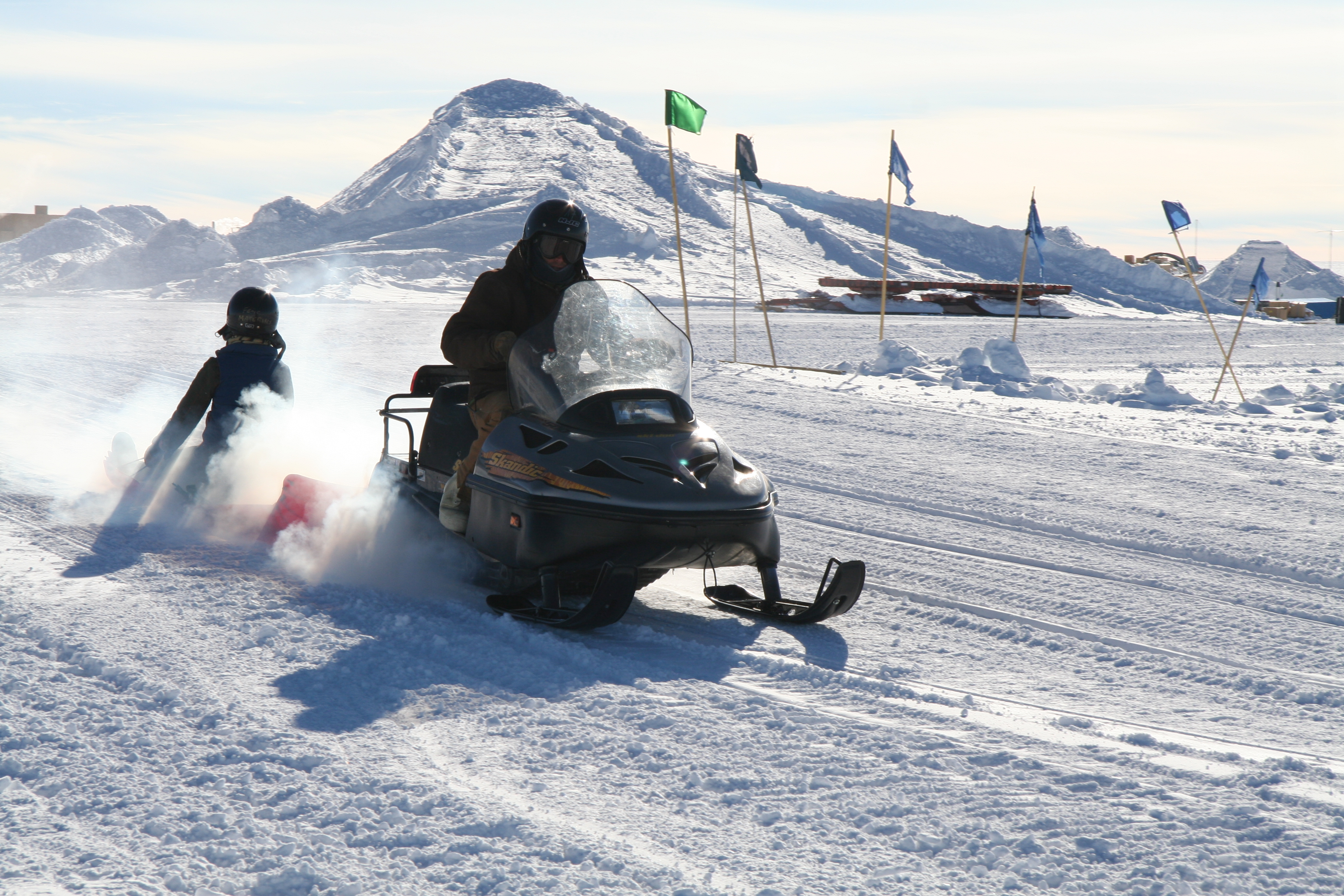 Casey O'Hara: "Sometimes, a cadaver sled is not available. Here a passenger is catching a ride on the red cargo sleds. Not nearly as comfortable, and probably less safe, and definitely more exhaust fumes!" Near the Amundsen-Scott South Pole Station, Antarctica.