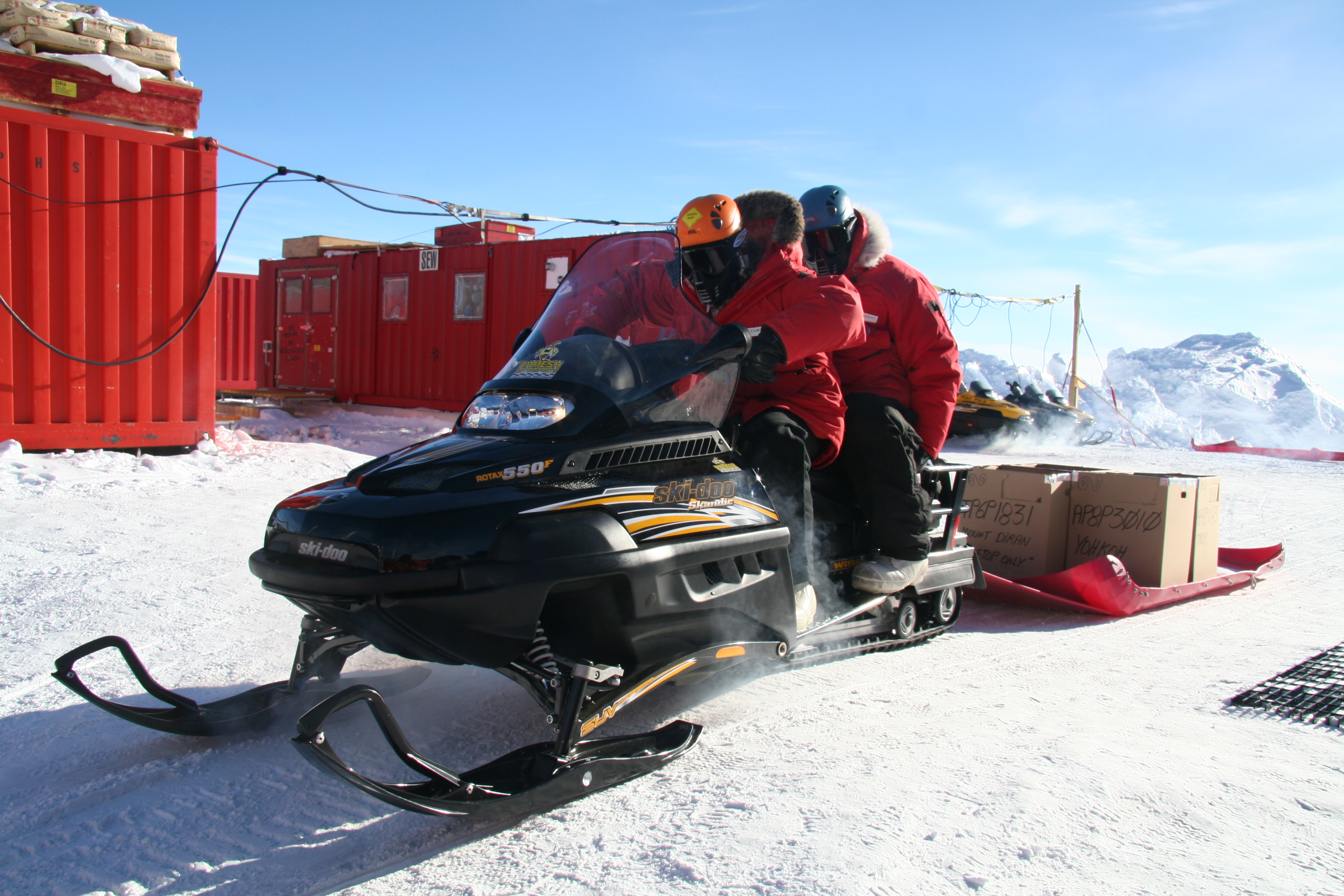 Casey O'Hara poses on a parked snowmobile. Near the Amundsen-Scott South Pole Station, Antarctica.