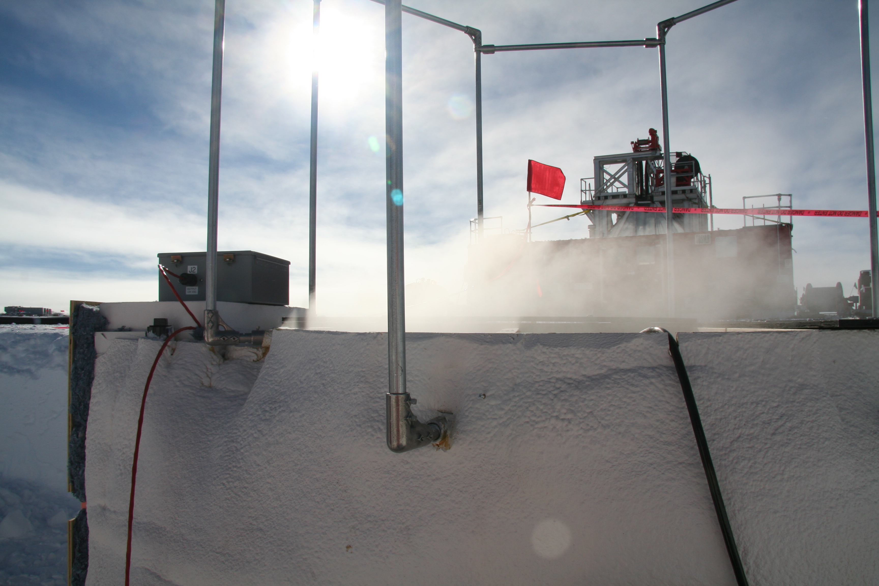 The IceTop tank is being filled with water at 25°C (about 77°F). Because the air is so cold a lot of steam is visible. Near the Amundsen-Scott South Pole Station, Antarctica.
