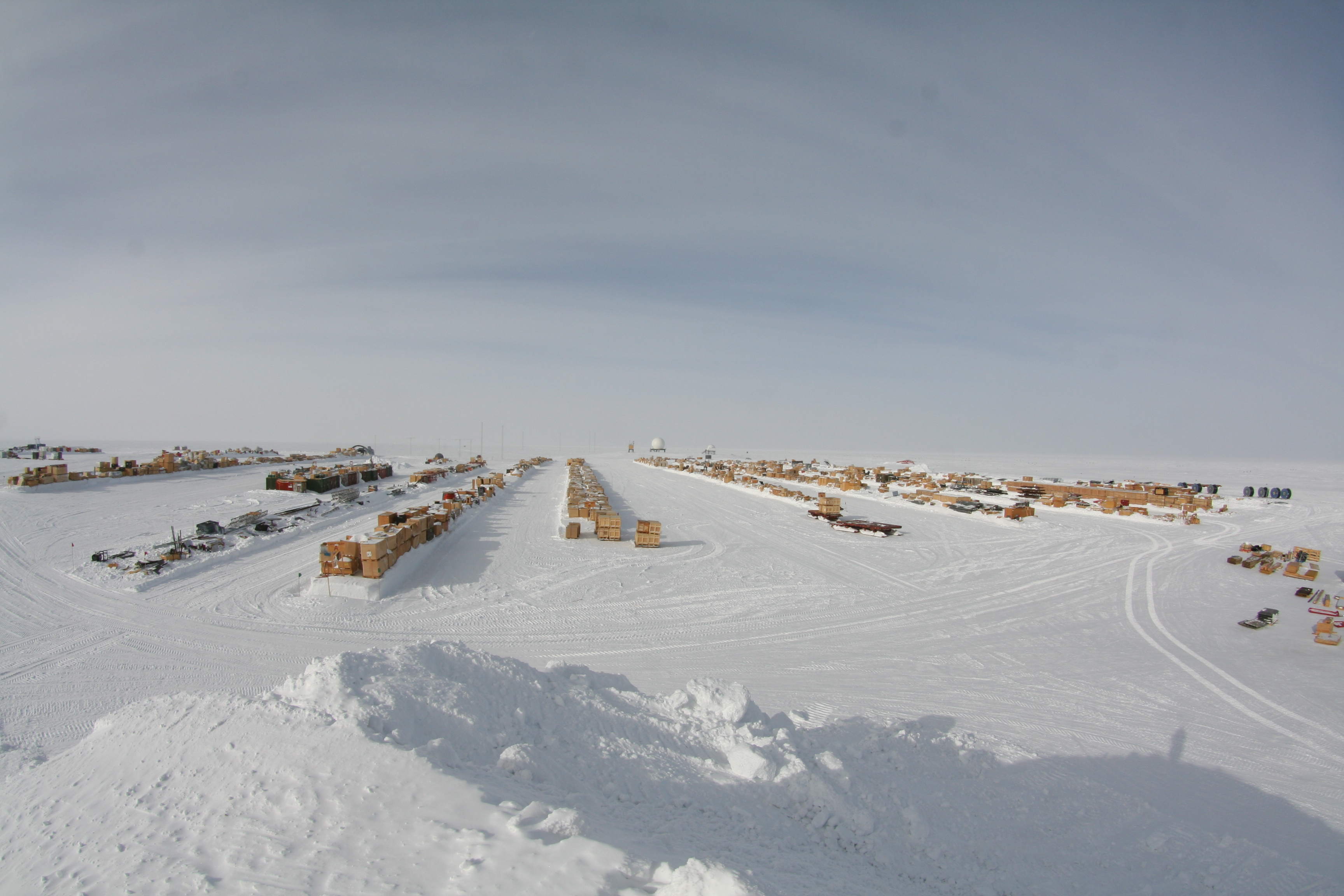 Casey O'Hara: "A view from atop a huge pile of snow, overlooking the rows of cargo stacked in the snow. Space is cheap, but keeping it clear of snow drifts requires almost constant maintenance." Near the Amundsen-Scott South Pole Station, Antarctica.