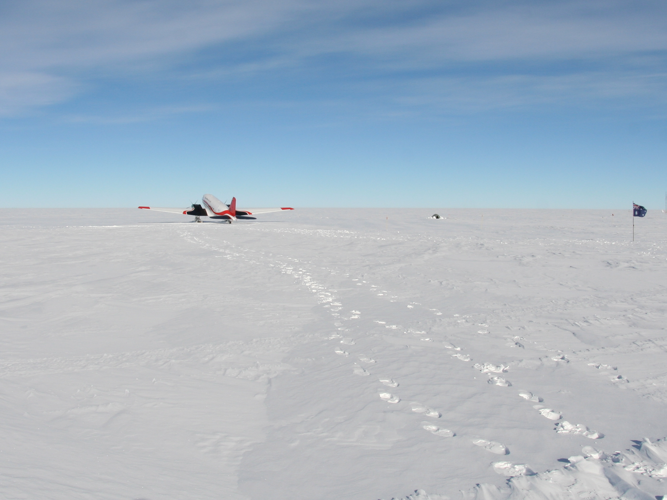 Casey O'Hara: "This plane carried a group of maybe 20 tourists to the south pole (note the footprints leading away from the plane). The tourists are given a tour, but not allowed to stay in the station (note the tiny building to the right -- that's the bathroom they get to use). They stay for a couple of hours, take photos at the pole markers, then get back on the plane. How much does a person pay for the privilege of being a south pole tourist? Apparently $40,000!" Near the Amundsen-Scott South Pole Station, Antarctica.