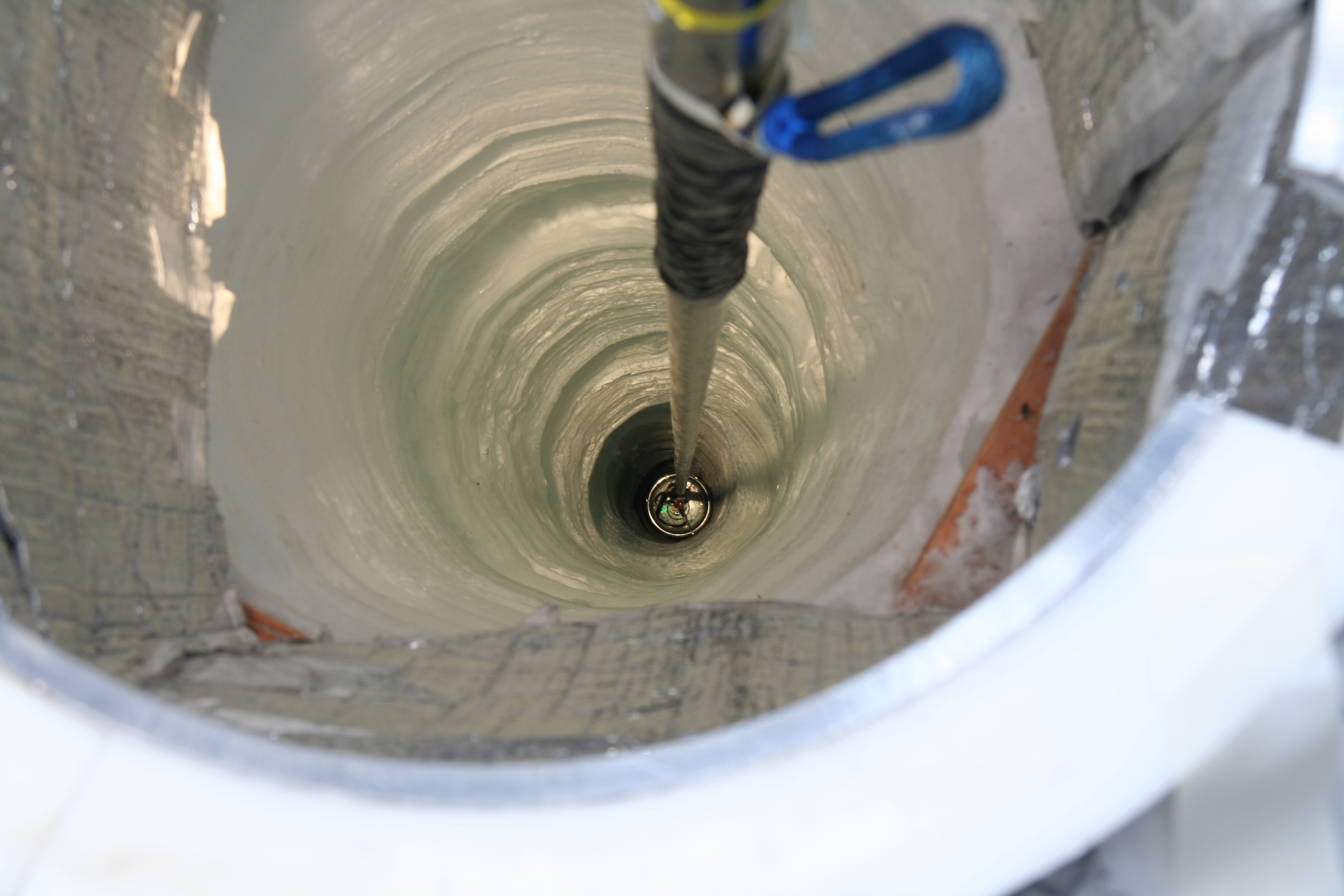 This is a view looking down into the hole drilled for the IceCube strings. The sphere you see is a digital optical module about 17 meters down. The entire hole is about 2.5 kilometers (about 1.5 miles) deep. It goes about 50 meters before it is filled with ice-cold water for the remaining 2,400 meters. The water eventually freezes around the string of DOMs, sealing them in forever. Near the Amundsen-Scott South Pole Station, Antarctica.