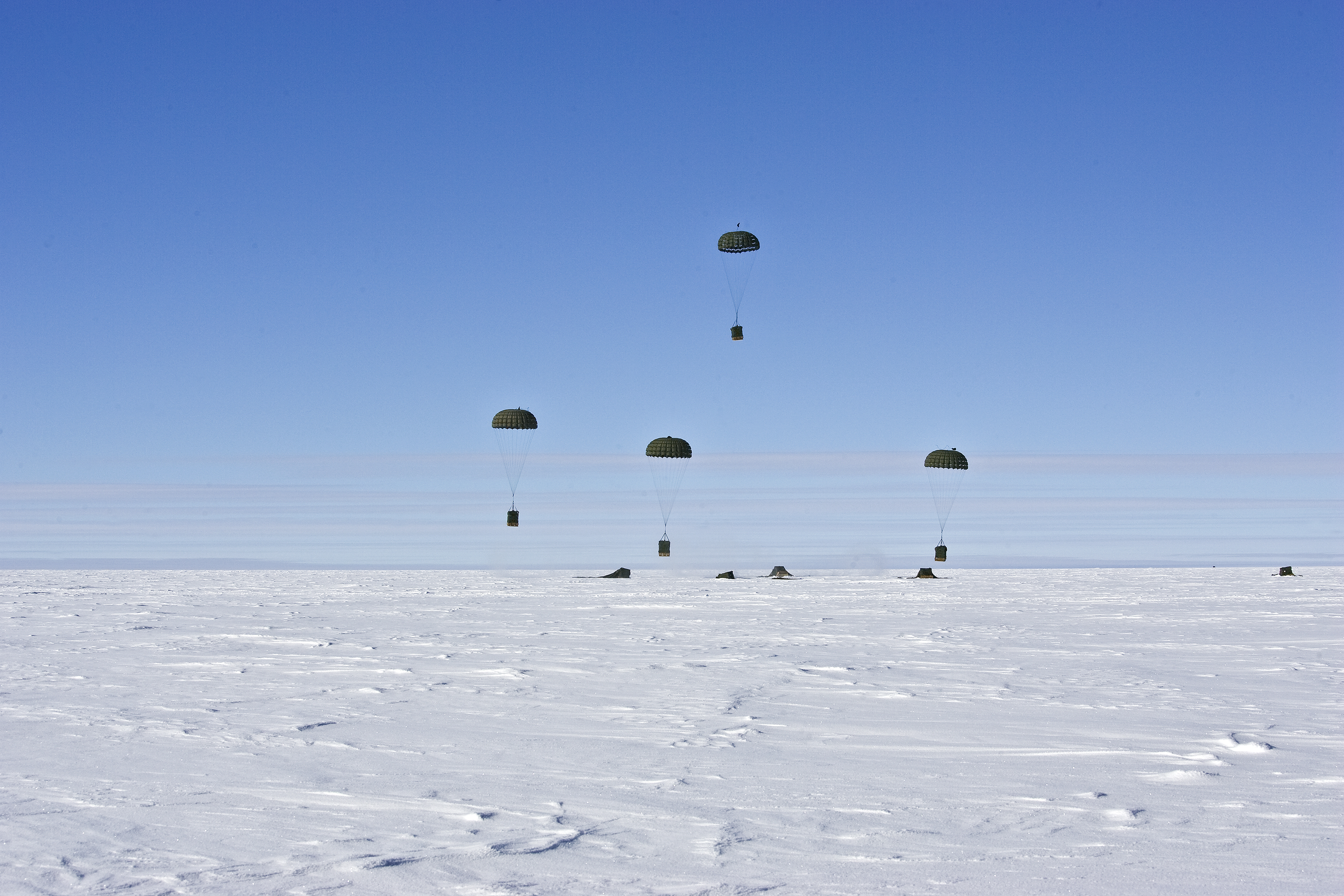Crates from the airdrop touch down onto the Antarctic snow. Near the Amundsen-Scott South Pole Station, Antarctica.