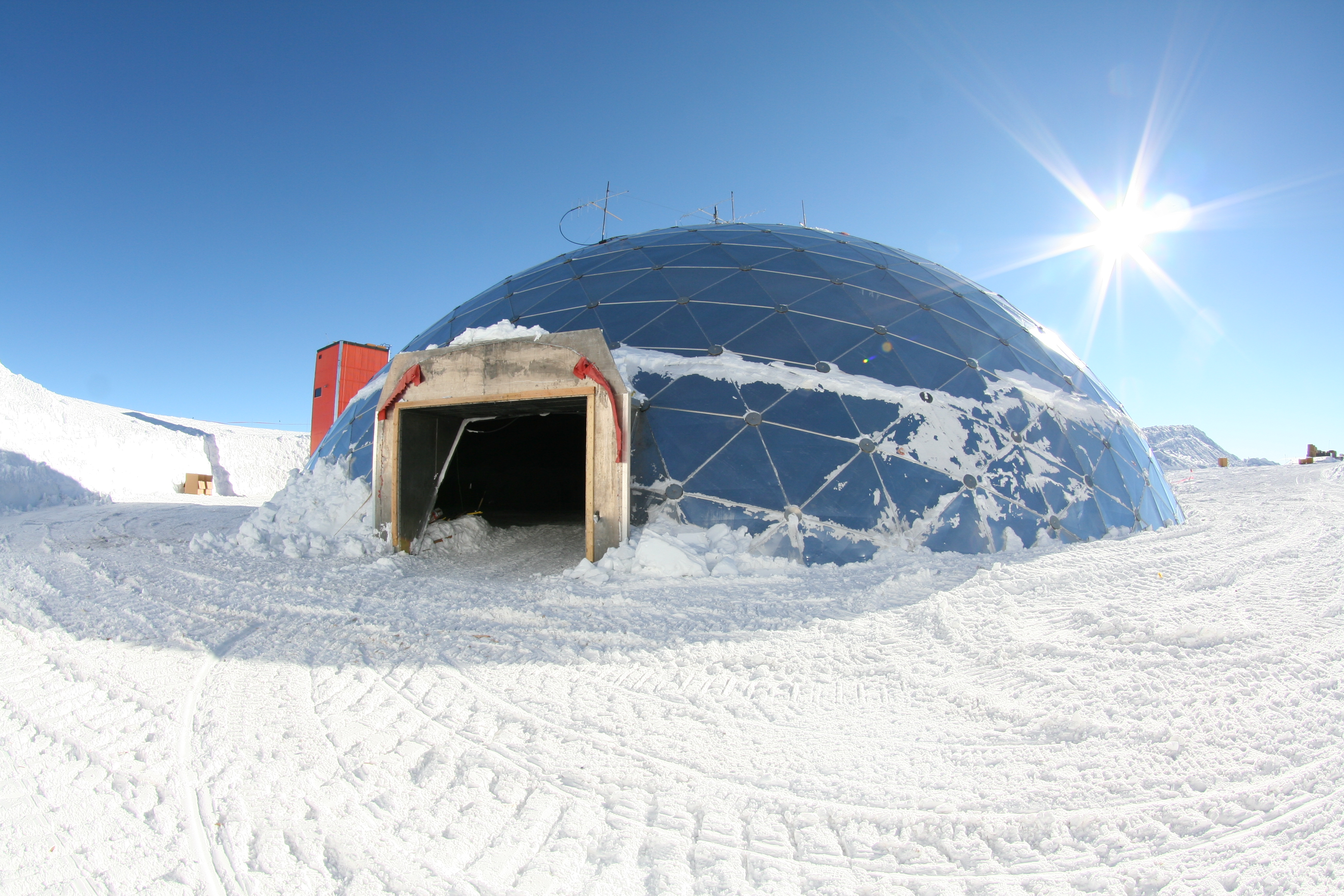 This is an outside view of the old dome station. Originally the entrance had a more elaborate tunnel, but it has been dismantled already. The dome is a geodesic dome built of aluminum triangles, and it is 50 meters across and 16 meters high. At the Amundsen-Scott South Pole Station, Antarctica.