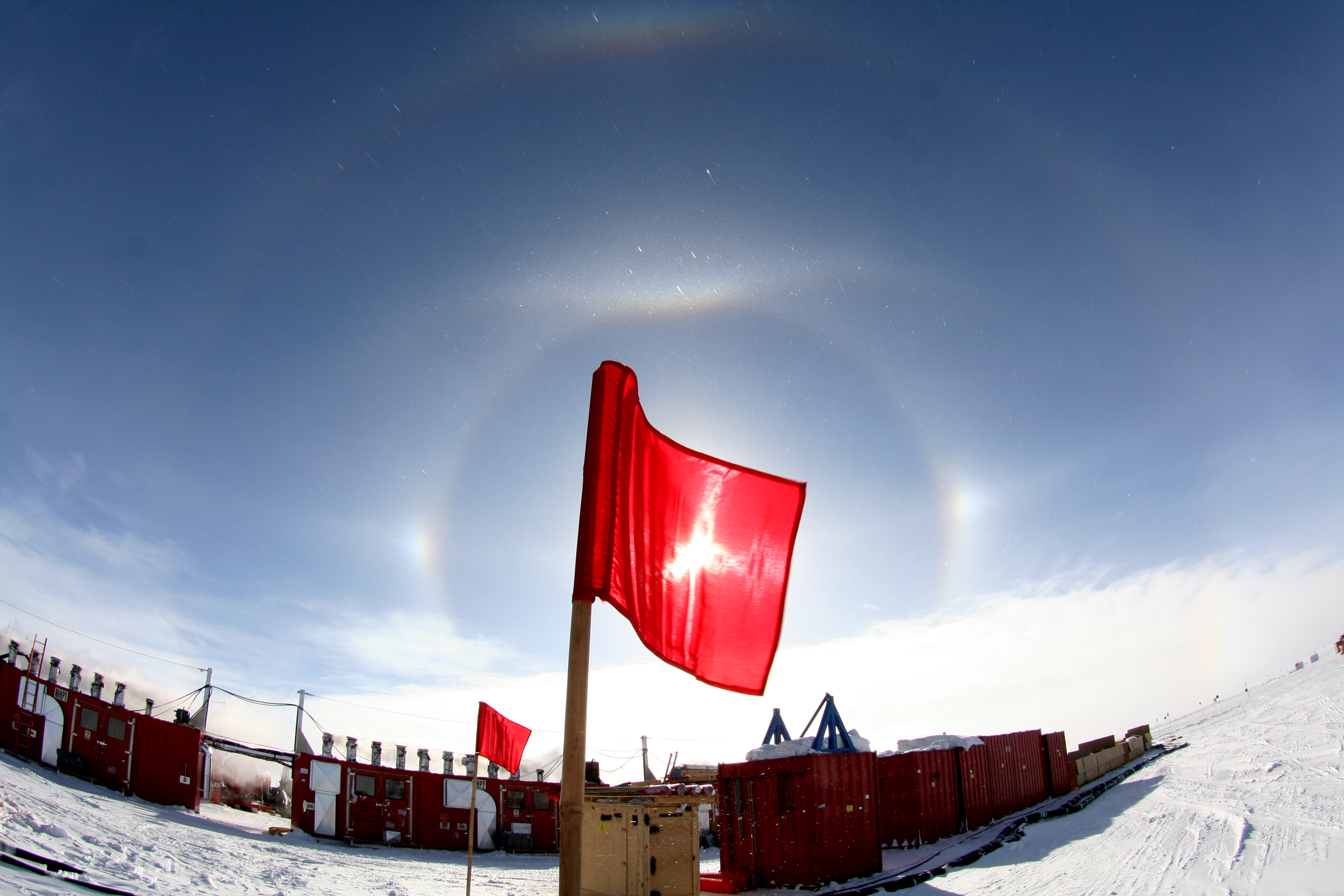 Casey O'Hara: "In the middle, you can see the halo, sun dogs, and tangent arc as in the previous photo. If you look closely around the outside, you can see a second halo (maybe a supralateral or a very rare 46° halo!) and a circumzenith arc on top!" Near the Amundsen-Scott South Pole Station, Antarctica.