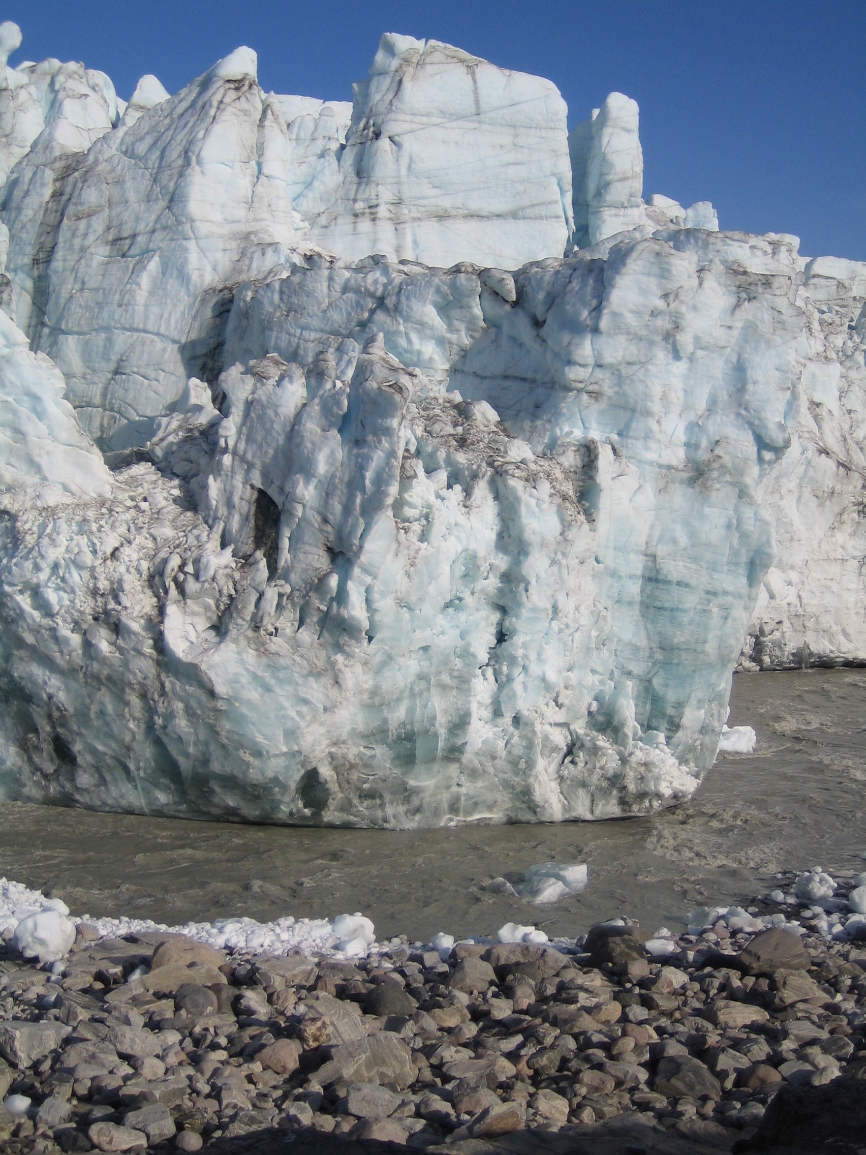 Blue ice and layers of sediment make up this ice cliff. Outside of Kangerlussuaq, Greenland.