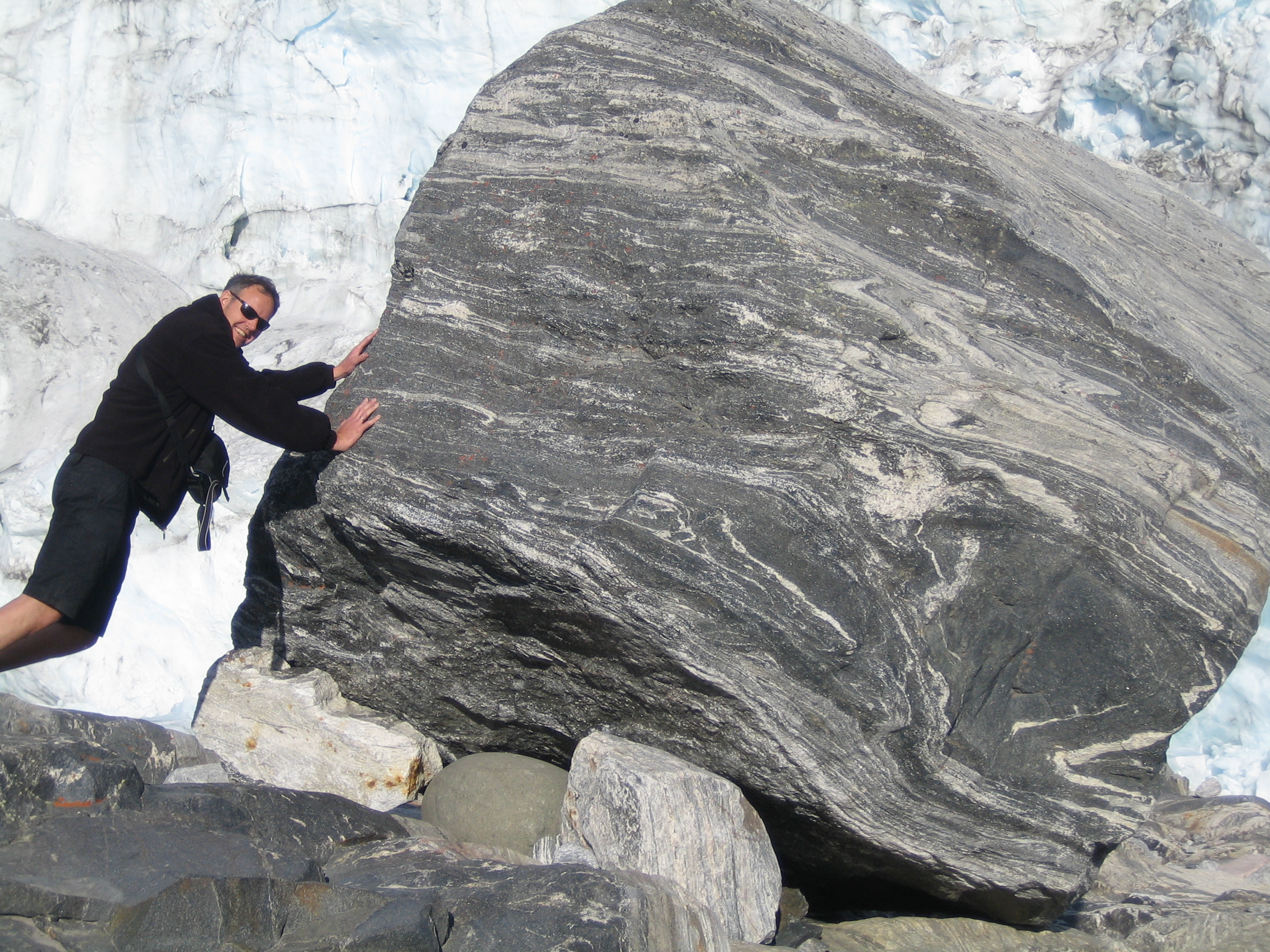Lars Larsen, a staff member of NEEM, is pushing a large boulder at the base of the glacier. Outside of Kangerlussuaq, Greenland.