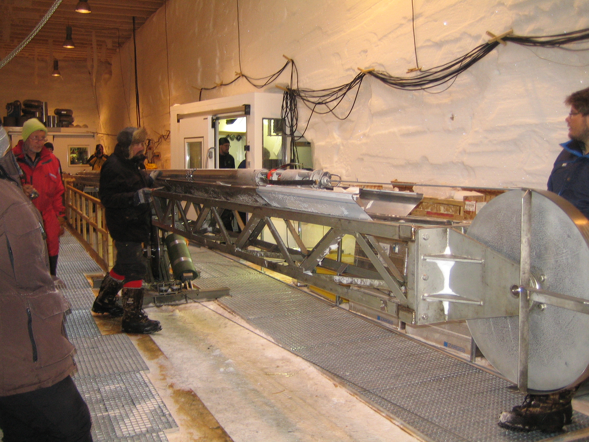 The drillers just brought up this core. Notice the enclosed room on the right where the technicians watch and control the drill with a computer. NEEM Camp, Greenland.