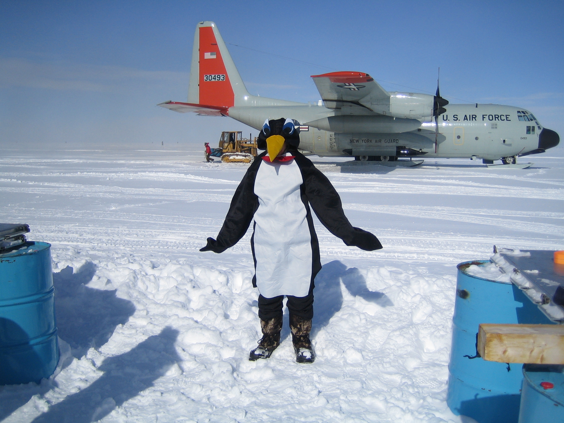 Cheri Hamilton poses in her penguin suit before leaving camp. NEEM Camp, Greenland.
