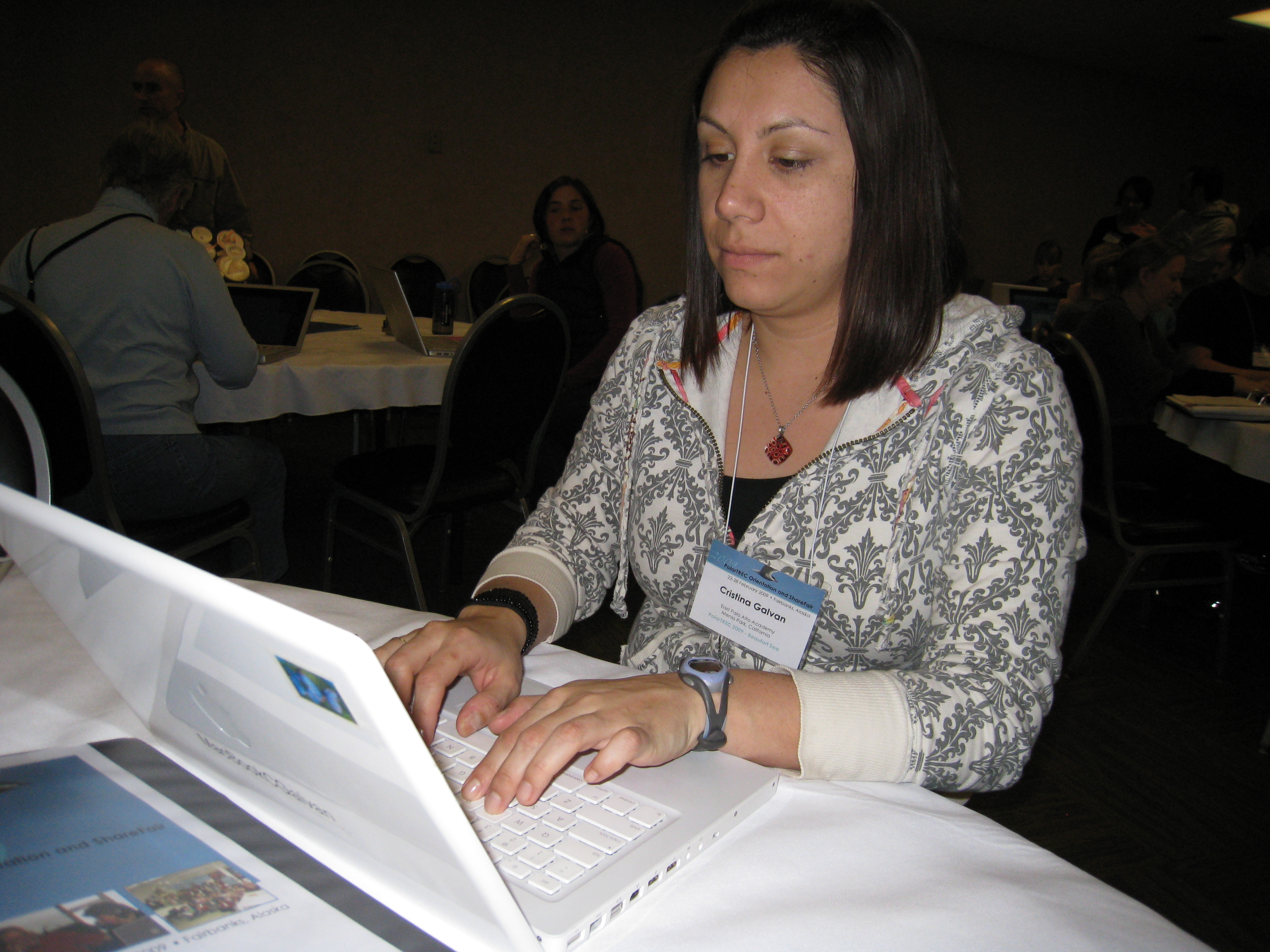 Cristina Galvan learns how to upload pictures to the online photo gallery, during PolarTREC Orientation. At the Westbank Hotel in Fairbanks, Alaska.