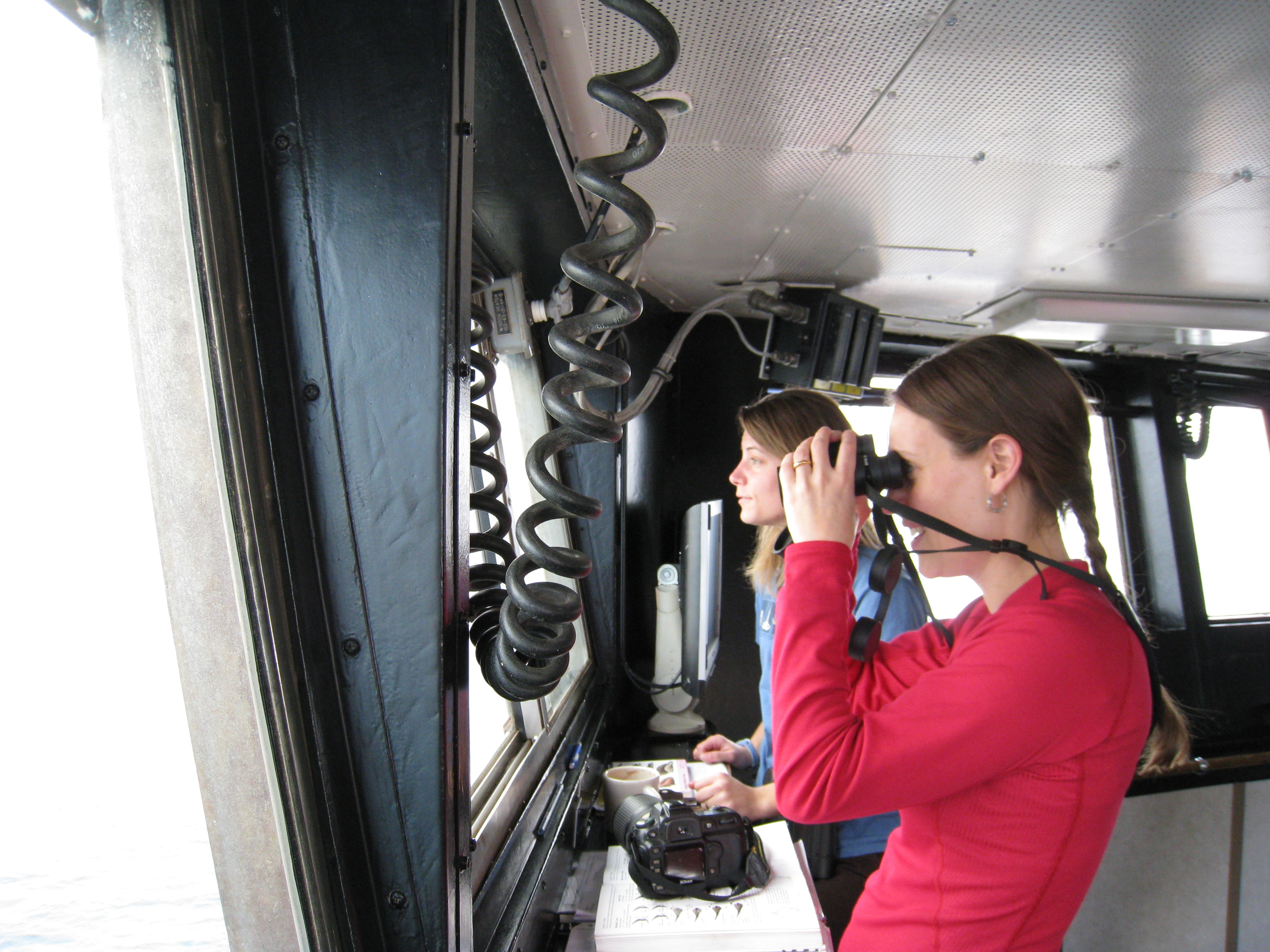 Up on the bridge, Katie and Alex are on the look out for birds and mammals. Aboard the USCGC Polar Sea icebreaker in the Beaufort Sea.