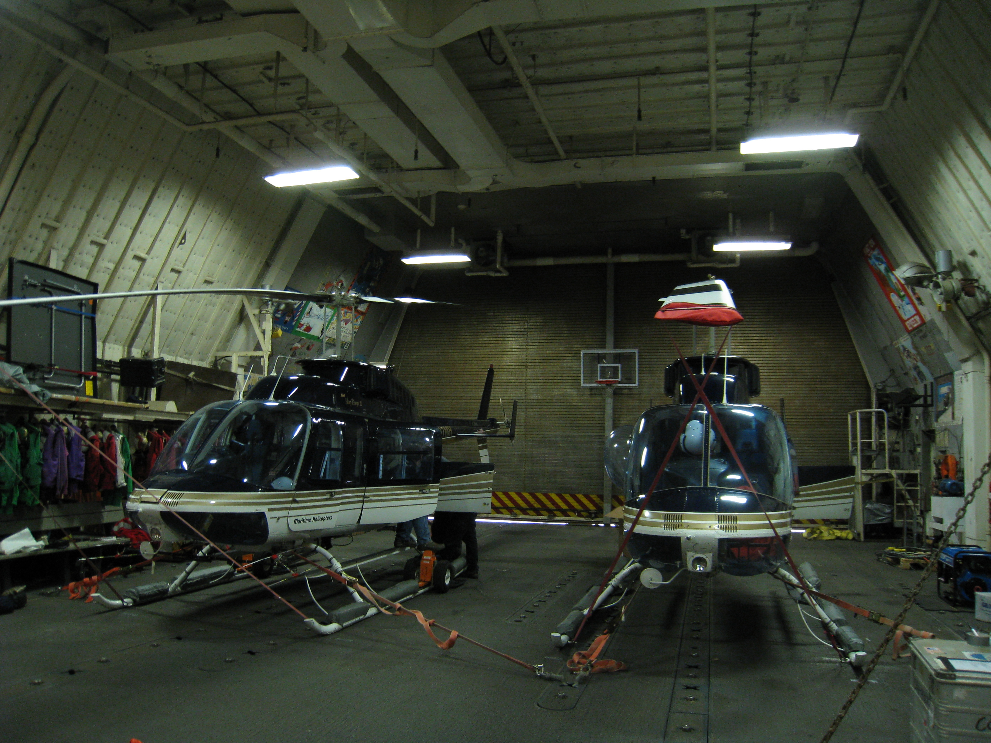 Two helicopters are able to fit inside the hanger. Aboard the USCGC Polar Sea icebreaker in the Beaufort Sea.