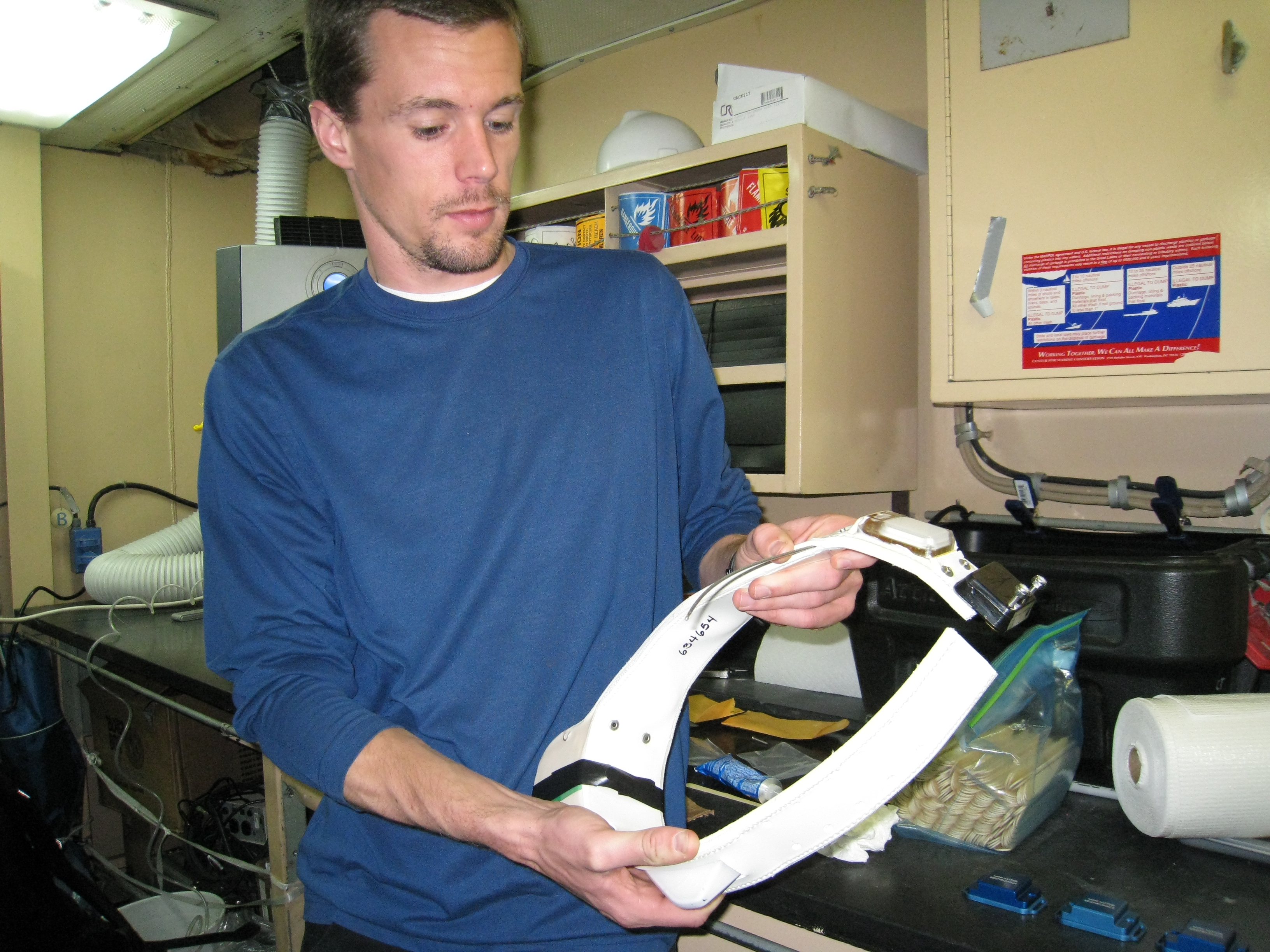John Whiteman explains the three antennas that the tracking collars use to track the polar bears as well as the automatic release mechanism. Aboard the USCGC Polar Sea icebreaker in the Beaufort Sea.