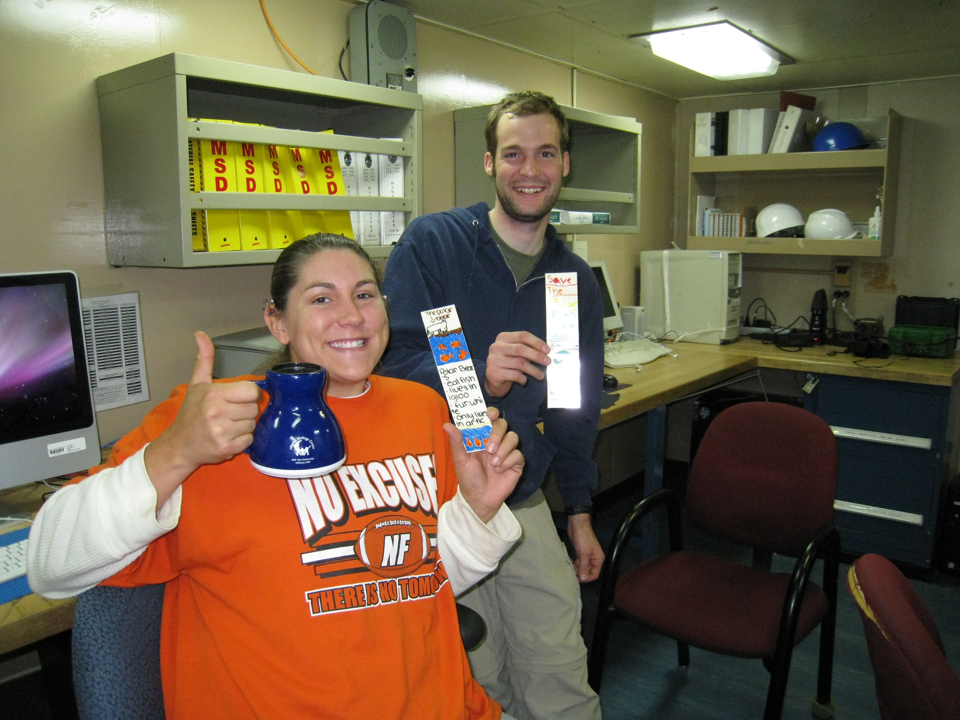 Cristina Galvan: "Dawn Sechler and Dan Whiting also pose with their bookmarks, thanks to the 5th graders in Ms Rubio's class." Aboard the USCGC Polar Sea icebreaker in the Beaufort Sea.