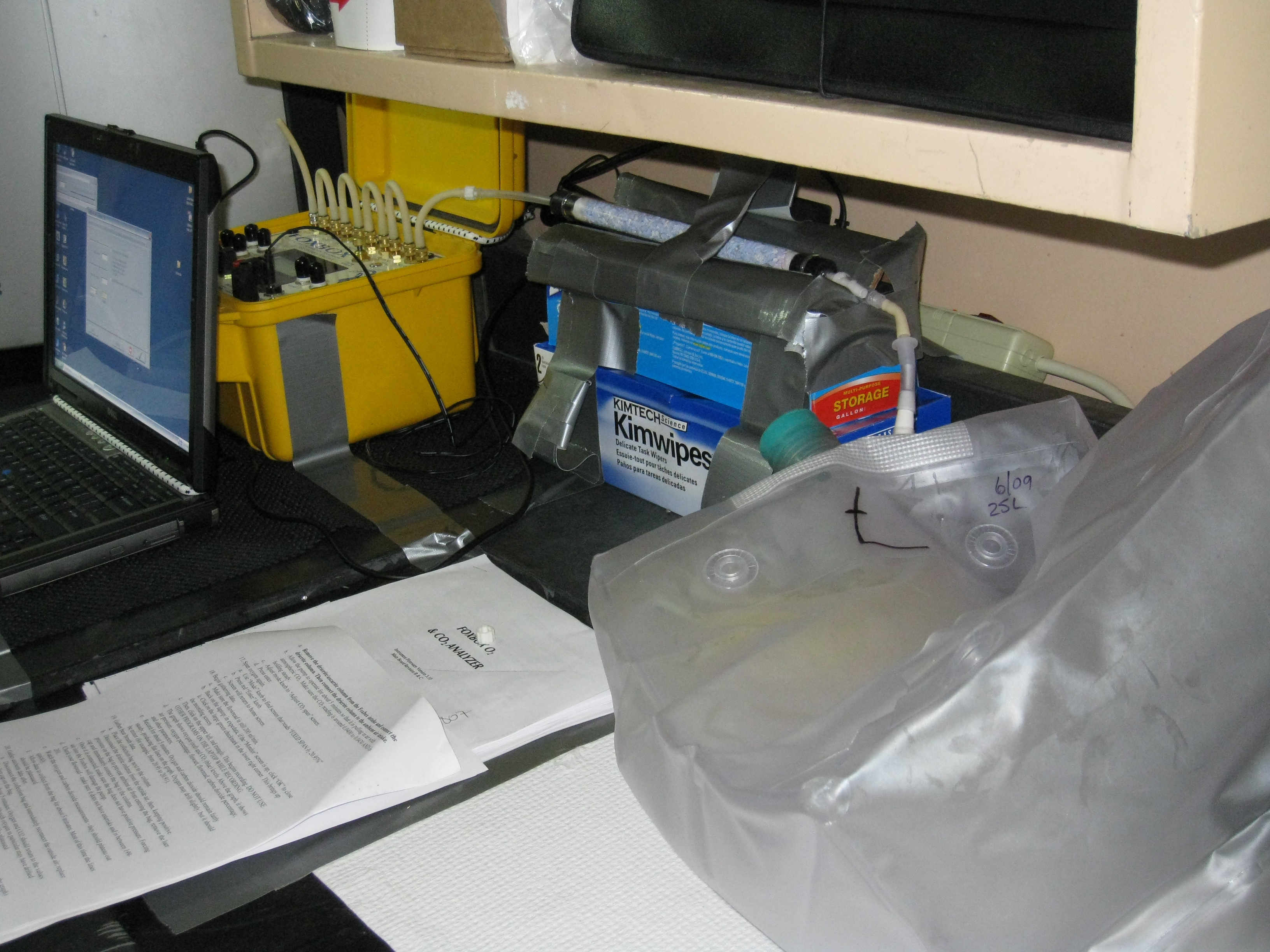The Foxbox (the yellow box) is used to analyze carbon dioxide and oxygen levels in the breath of an animal. Aboard the USCGC Polar Sea icebreaker in the Beaufort Sea.