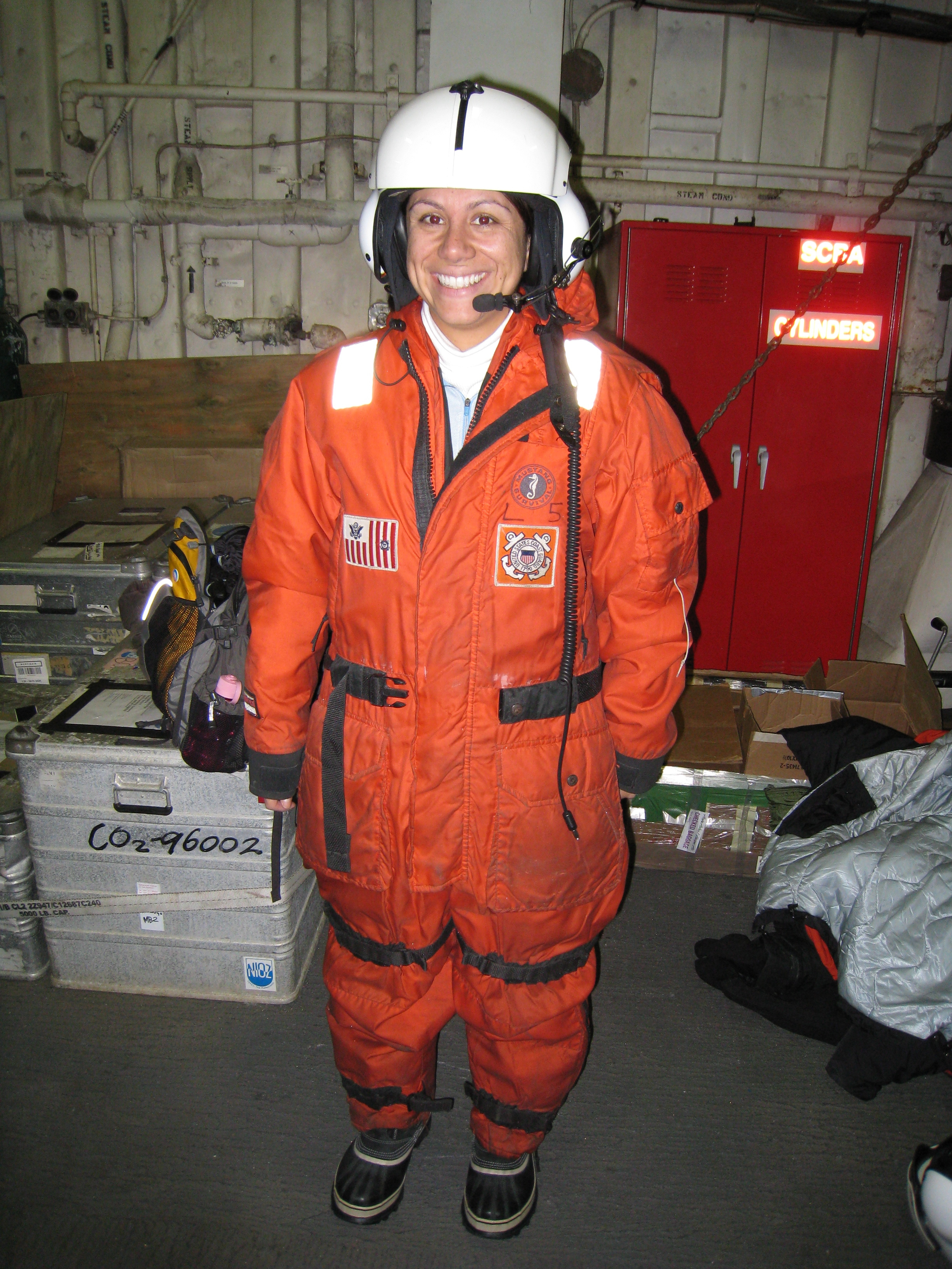 Cristina Galvan wears her flight gear and is ready to take off in the helicopter. Aboard the USCGC Polar Sea icebreaker in the Beaufort Sea.