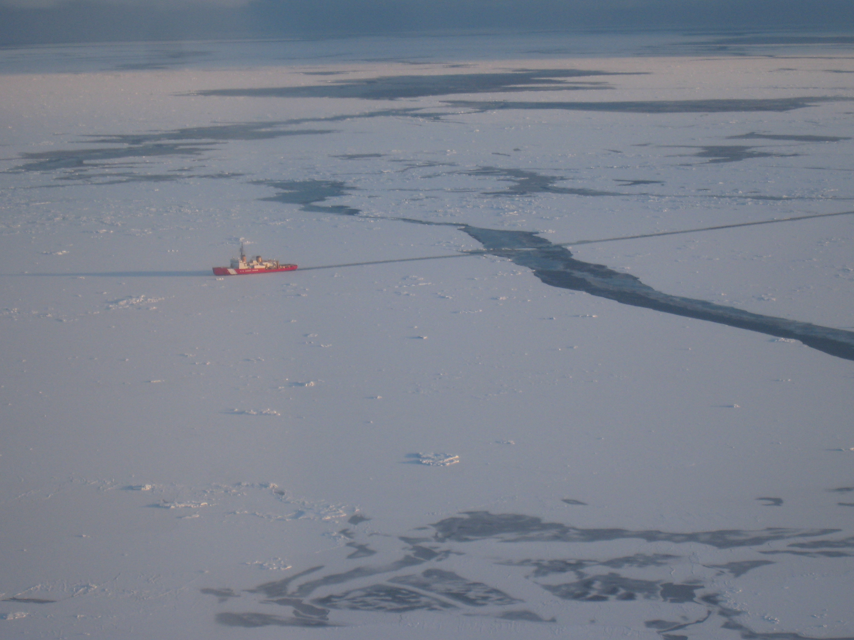 Cristina Galvan: "Watching the Polar Sea as we left in the helicopter, it started to sink in how just far in the middle of nowhere we are. We are just a speck in a sea of ice." In the helicopter, above the USCGC Polar Sea icebreaker in the Beaufort Sea.