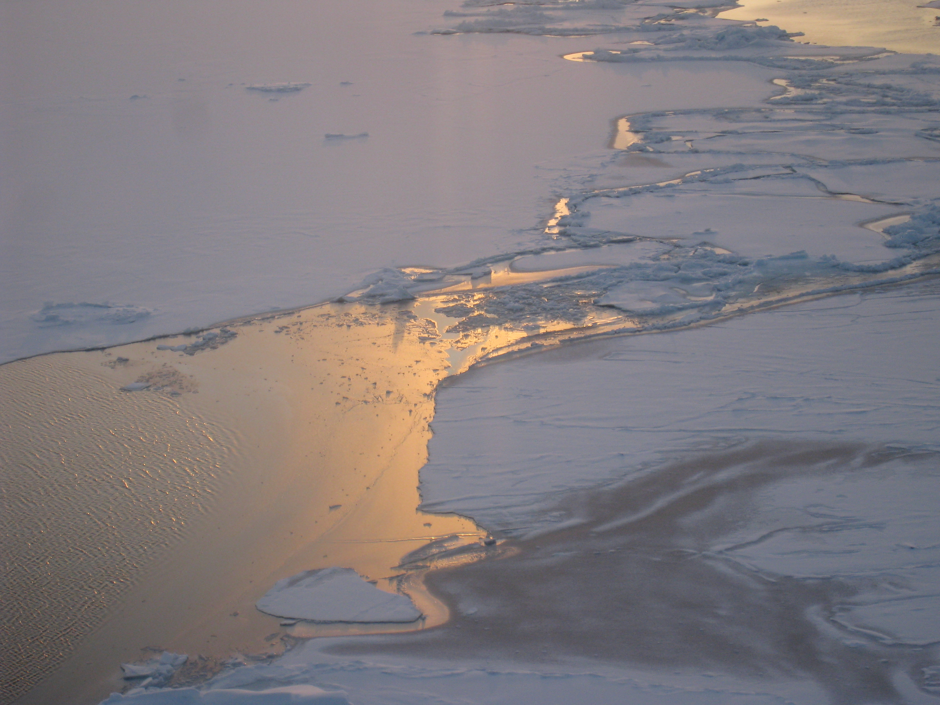 Cristina Galvan: "As the sun began to set, the reflection off the water and the ice around it became mesmerizing." In the helicopter above the Beaufort Sea.