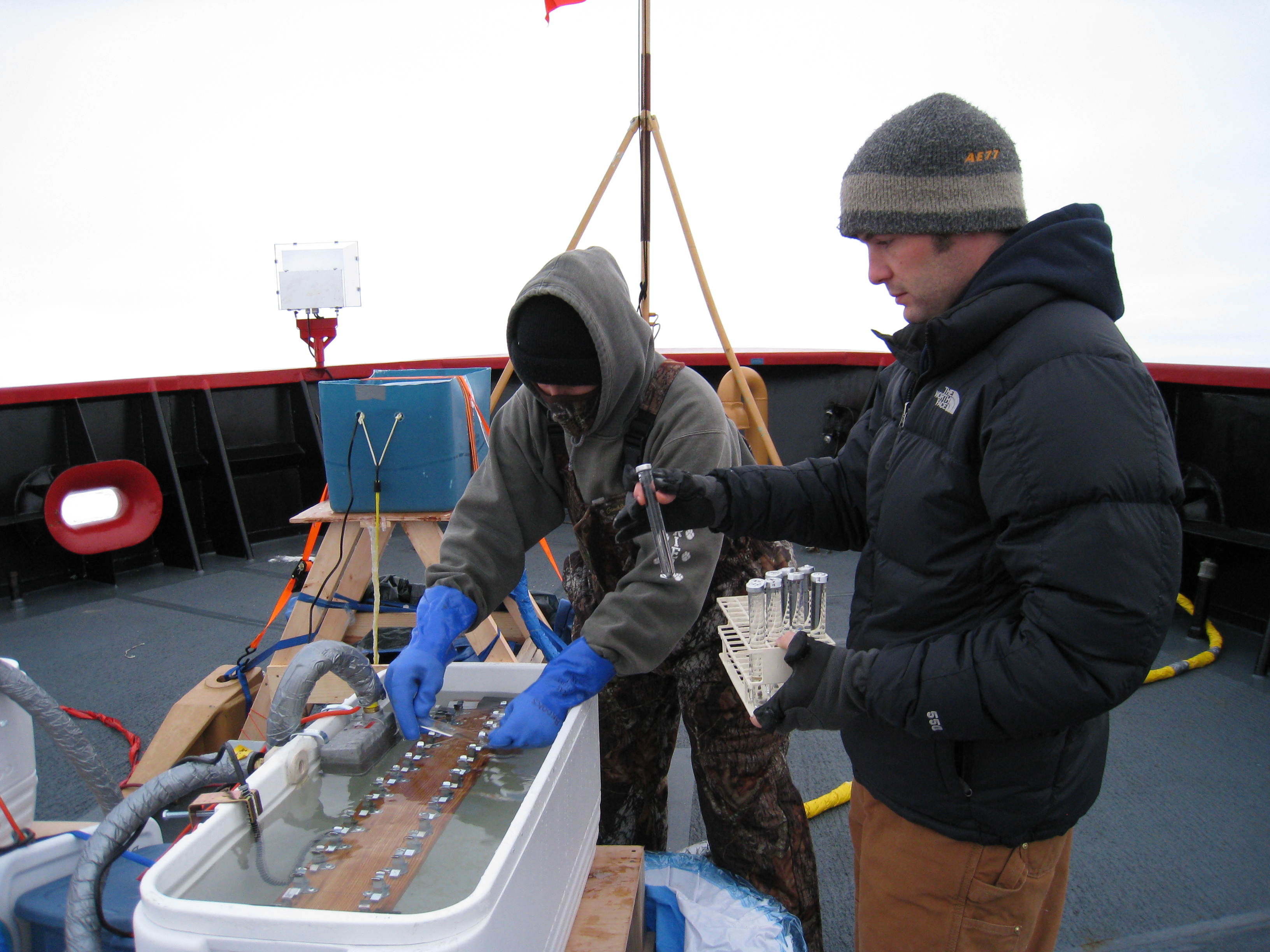 Dawn Sechler and Dan Whiting place the test tubes with water samples into their set-up. Aboard the USCGC Polar Sea icebreaker in the Beaufort Sea.