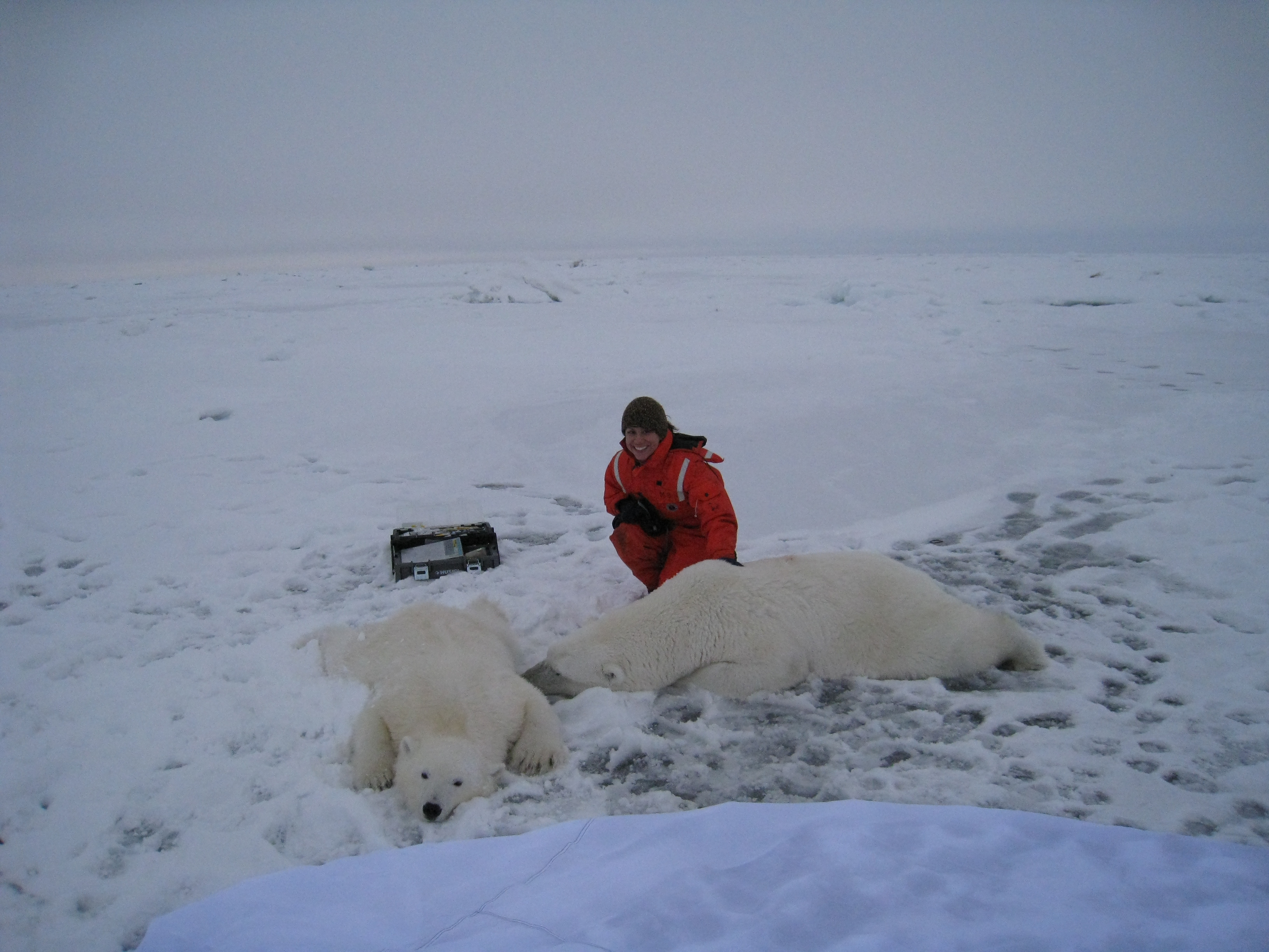 Cristina Galvan poses with the adult mother bear and the female cub. They are both tranquilized for some quick research. On the sea ice, near the USCGC Polar Sea icebreaker in the Beaufort Sea.