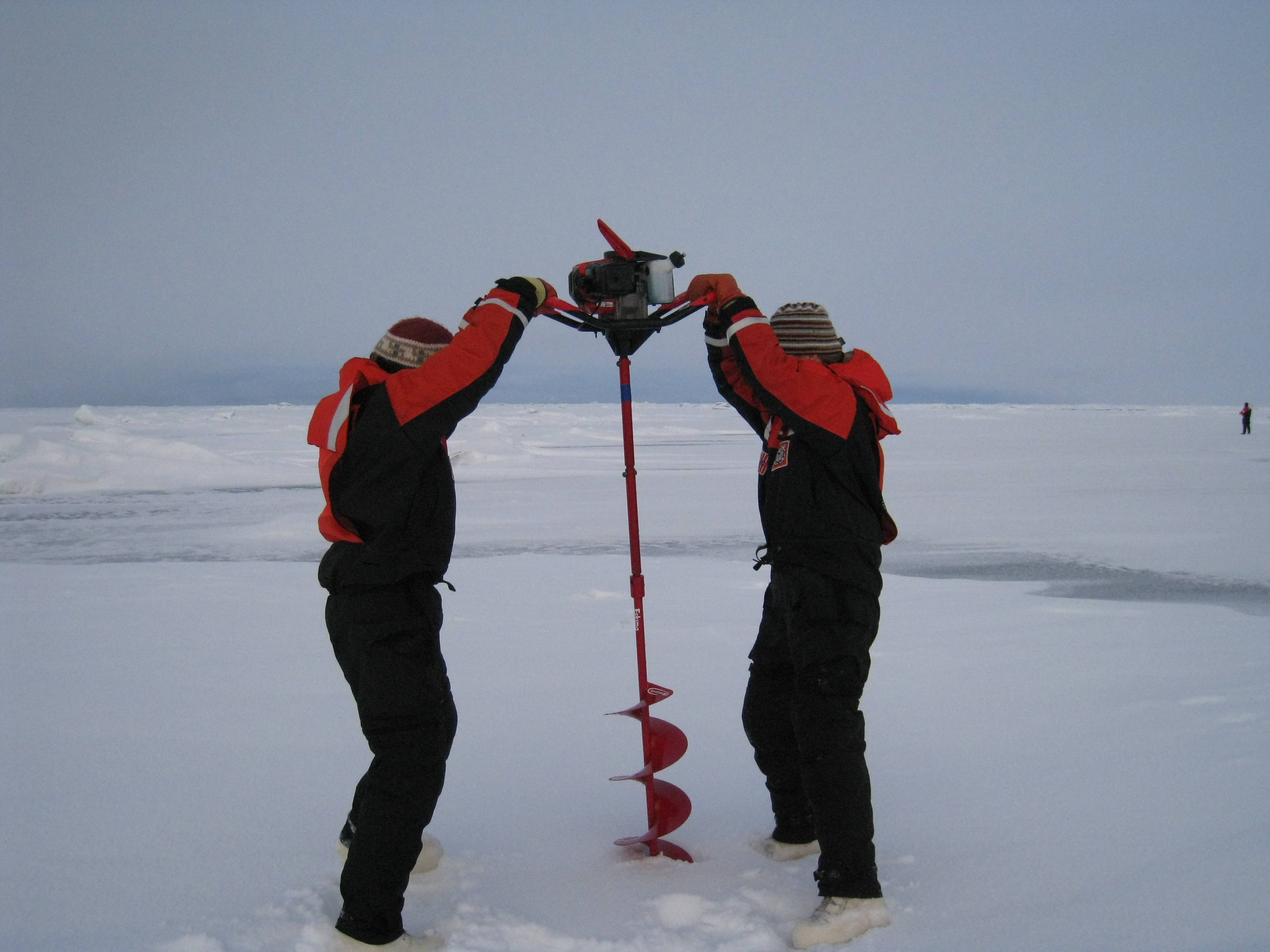 Brenna and Mette drill a hole into the sea ice so that they can collect water samples. On the sea ice, near the USCGC Polar Sea icebreaker in the Beaufort Sea.