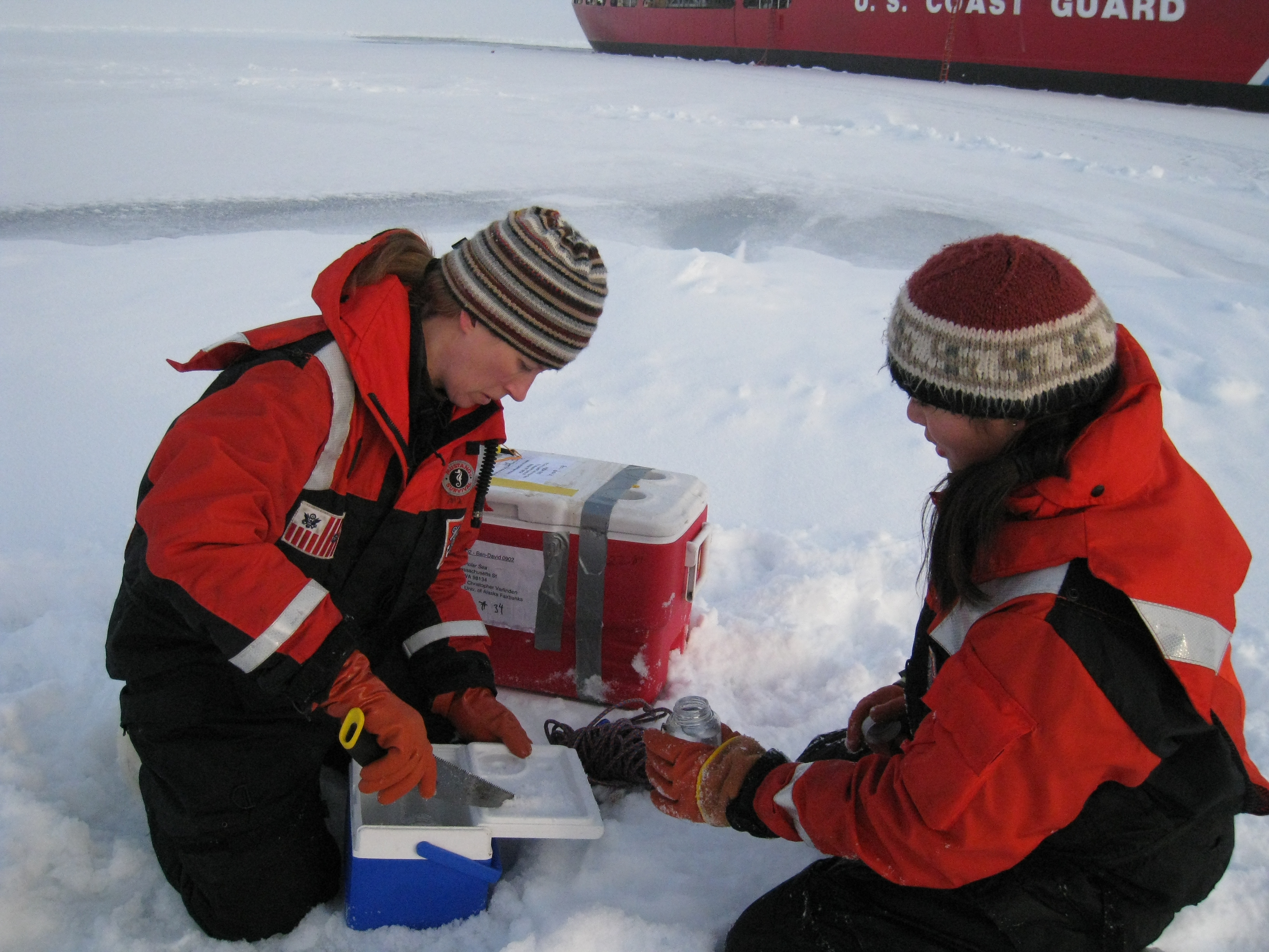 Brenna and Mette cut the ice core into layers and separate them into plastic bags. On the sea ice, near the USCGC Polar Sea icebreaker in the Beaufort Sea.